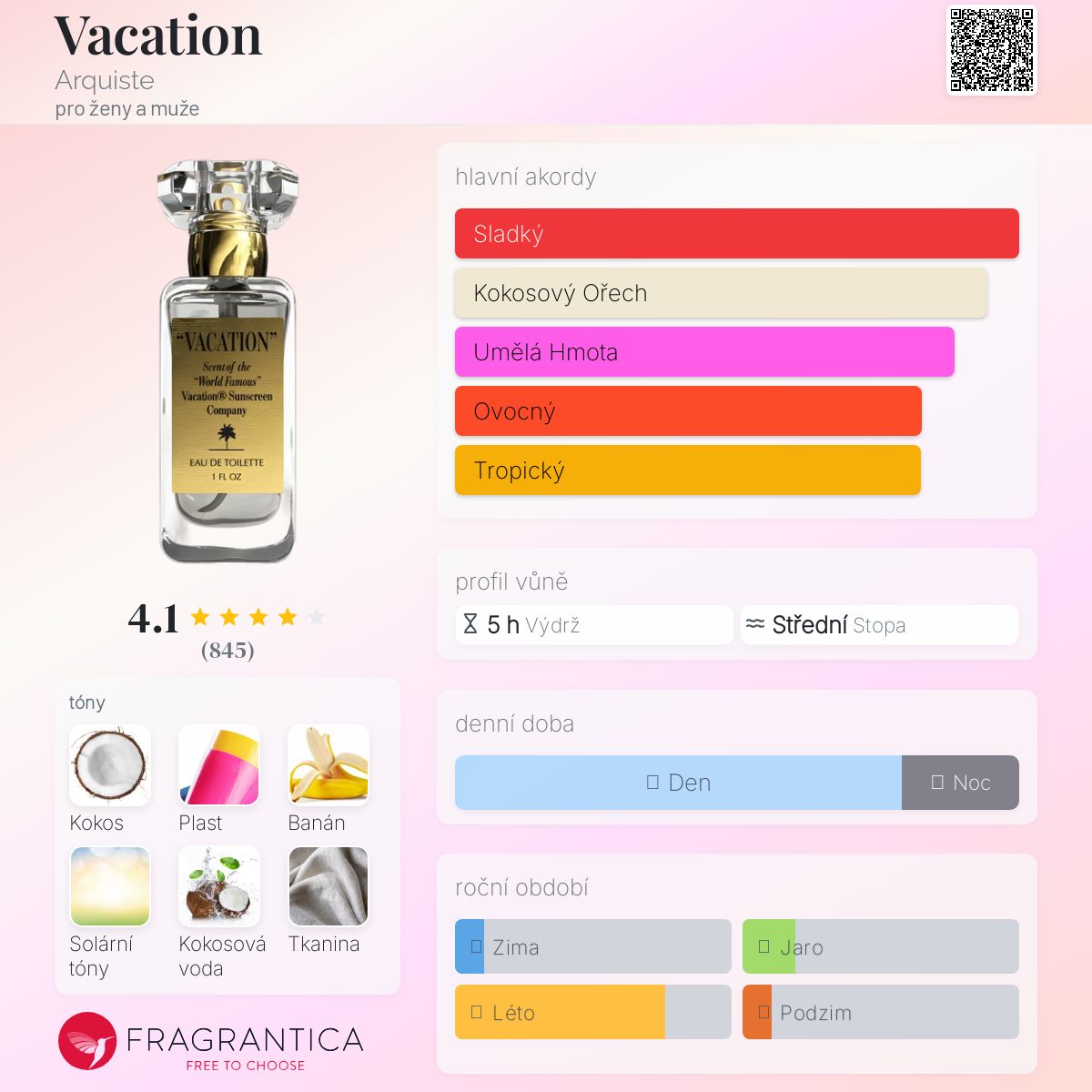 Vacation podle Arquiste je Aromatic Aquatic vůně pro ženy a muže. Vacation byl/a uveden/a v roce 2021. "Nosem" za touto vůní je Rodrigo Flores-Roux. Vrchní tóny jsou Kokosové mléko, Kokosová voda a Petitgrain; střední tóny jsouBanán, Solární tóny, Ananas, Pižmo a Bergamot ; základní tóny jsou Plast, Tkanina, Vodnaté tóny a Mořská sůl.