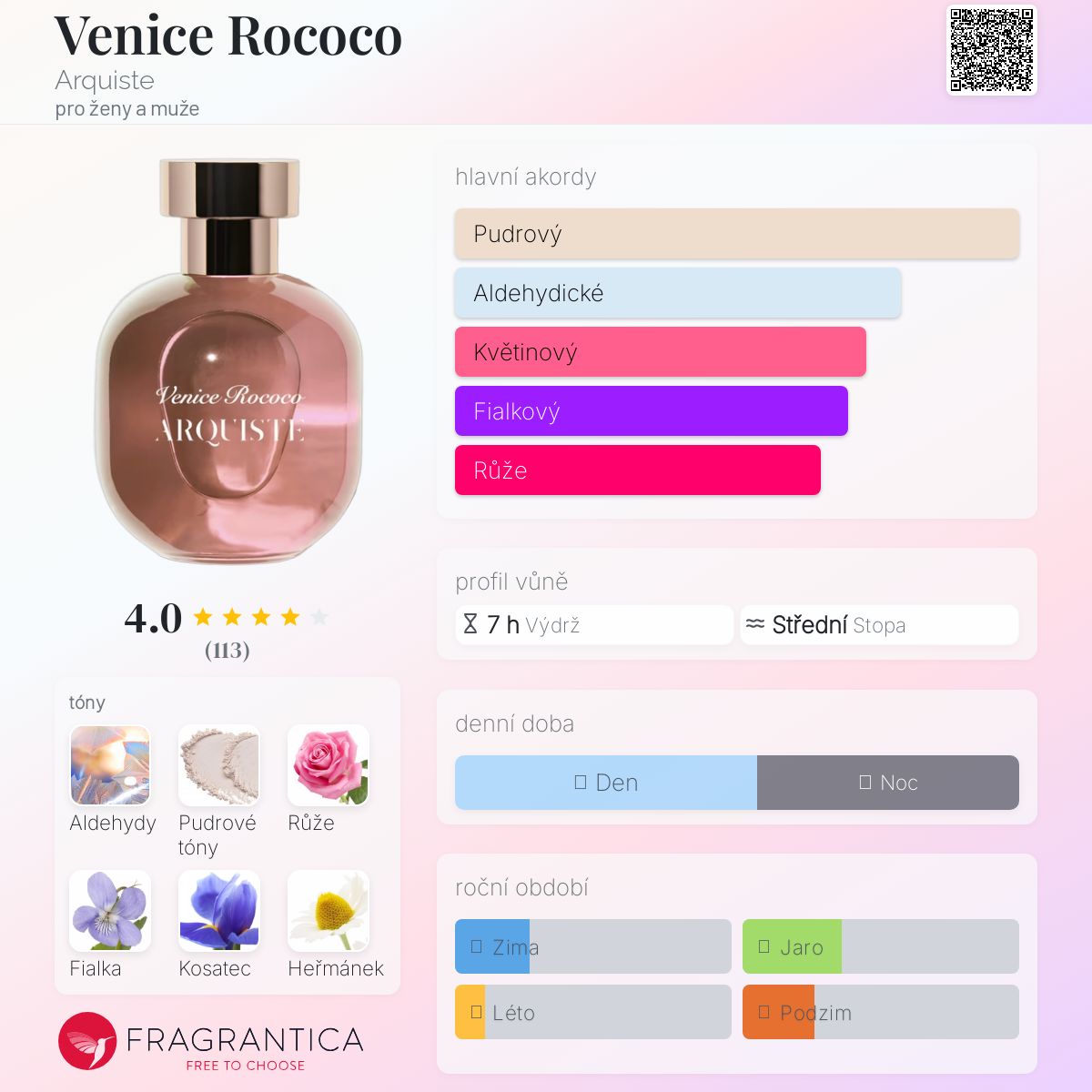 Venice Rococo podle Arquiste je Floral Woody Musk vůně pro ženy a muže. Toto je nová vůně. Venice Rococo byl/a uveden/a v roce 2024. "Nosem" za touto vůní je Rodrigo Flores-Roux. Vrchní tóny jsou Aldehydy, Turecká růže, Heřmánek a Hloh; střední tóny jsouPudrové tóny, Černá fialka, Kmín a Pomeranč ; základní tóny jsou Kosatec, Cibetka, Jantar (ambra) a Jasmín.