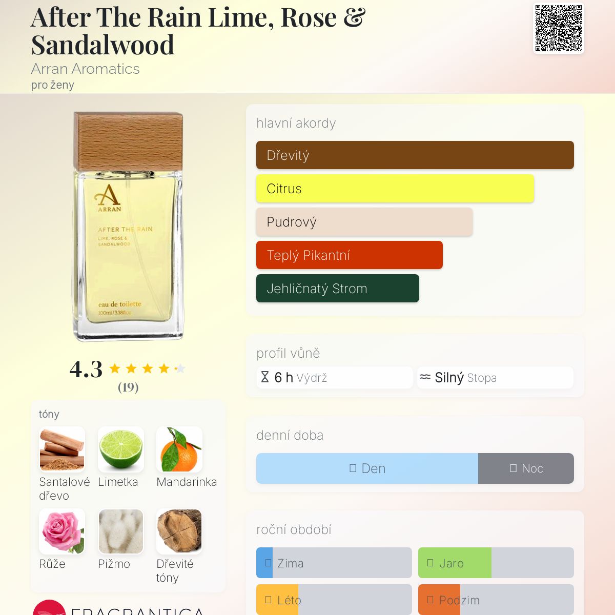 After The Rain Lime, Rose & Sandalwood podle Arran Aromatics je Floral vůně pro ženy. After The Rain Lime, Rose & Sandalwood byl/a uveden/a v roce 2015. Vrchní tóny jsou Limetka, Mandarinka a Citrón; střední tón jeRůže ; základní tóny jsou Santalové dřevo, Pižmo a Vzácné dřevo.