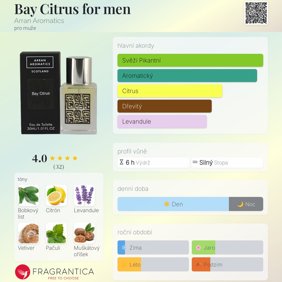 Bay Citrus for men podle Arran Aromatics je Aromatic Spicy vůně pro muže. Vrchní tóny jsou Citrón, Levandule a Máta; střední tóny jsouBobkový list, Pačuli a Muškátový oříšek ; základní tón je Vetiver.