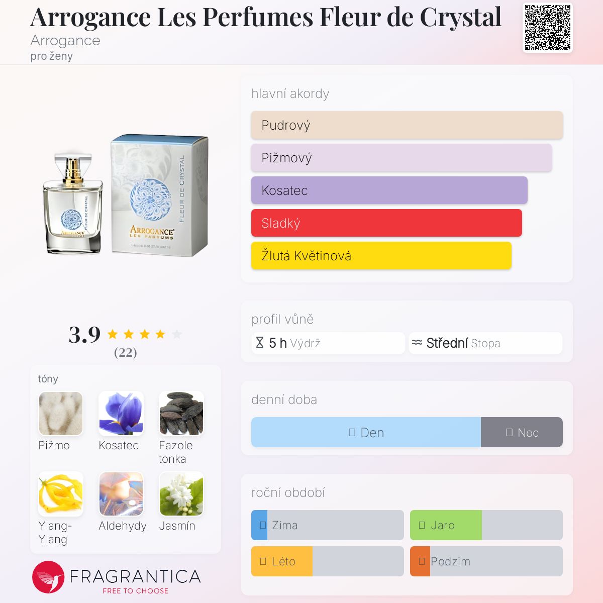Arrogance Les Perfumes Fleur de Crystal podle Arrogance je Floral Aldehyde vůně pro ženy. Arrogance Les Perfumes Fleur de Crystal byl/a uveden/a v roce 2010. Vrchní tóny jsou Kosatec, Aldehydy a Jasmín; střední tóny jsouPižmo, Ylang-Ylang a Konvalinka ; základní tóny jsou Fazole tonka a Virginský cedr.
