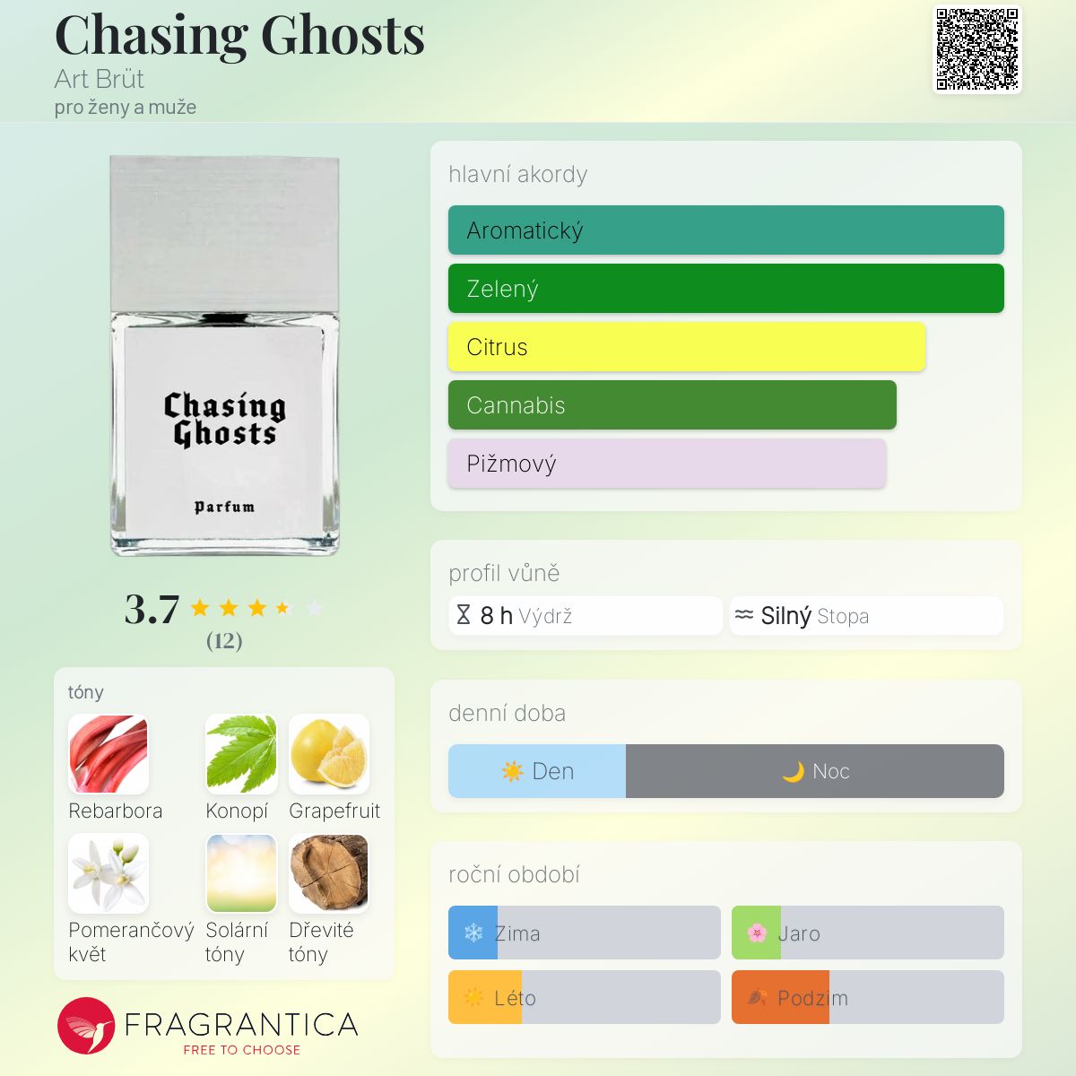 Chasing Ghosts podle Art Brüt je Woody Aromatic vůně pro ženy a muže. Toto je nová vůně. Chasing Ghosts byl/a uveden/a v roce 2024. "Nosem" za touto vůní je Margaux Le Paih Guérin. Vrchní tóny jsou Rebarbora, Konopí, Grapefruit a Růžový pepř; střední tóny jsouPomerančový květ, Solární tóny, Rýže a Čaj ; základní tóny jsou Dřevité tóny, Ambroxan, Pižmo a Kašmírové dřevo.