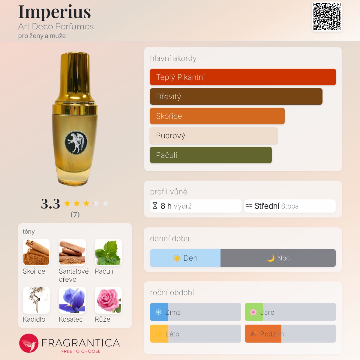Imperius podle Art Deco Perfumes je Aromatic Spicy vůně pro ženy a muže. Imperius byl/a uveden/a v roce 2015. "Nosem" za touto vůní je Elina Arsenieva. Vrchní tóny jsou Bergamot a Citrón; střední tóny jsouSkořice, Kosatec a Růže ; základní tóny jsou Santalové dřevo, Pačuli a Kadidlo.