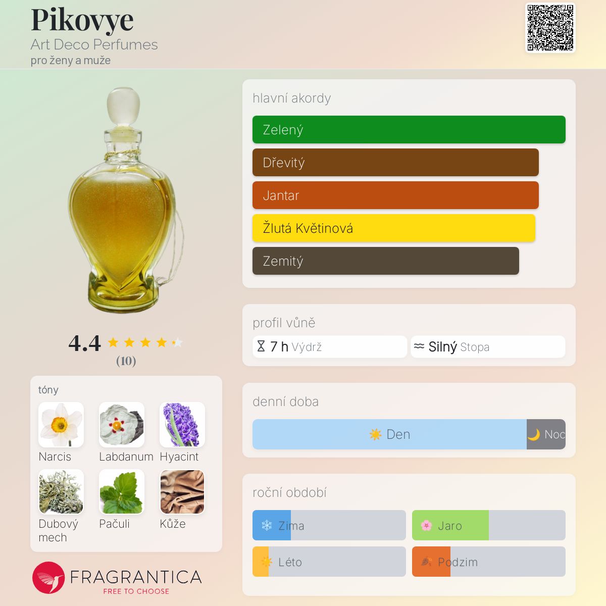 Pikovye podle Art Deco Perfumes je Floral vůně pro ženy a muže. Pikovye byl/a uveden/a v roce 2015. "Nosem" za touto vůní je Elina Arsenieva. Vrchní tóny jsou Hořký pomeranč a Bergamot; střední tóny jsouNarcis, Hyacint a Kosatec ; základní tóny jsou Labdanum, Dubový mech, Pačuli, Kůže, Santalové dřevo a Dřevité tóny.