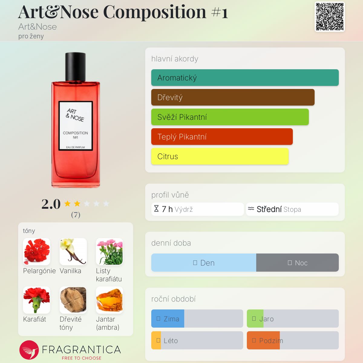Art&Nose Composition #1 podle Art&Nose je Woody Spicy vůně pro ženy. Toto je nová vůně. Art&Nose Composition #1 byl/a uveden/a v roce 2024. Vrchní tóny jsou Bergamot, Švestka, Citrón a Jablko; střední tóny jsouPelargónie, Listy karafiátu, Karafiát a Dřevité tóny ; základní tóny jsou Vanilka, Jantar (ambra) a Cedr.