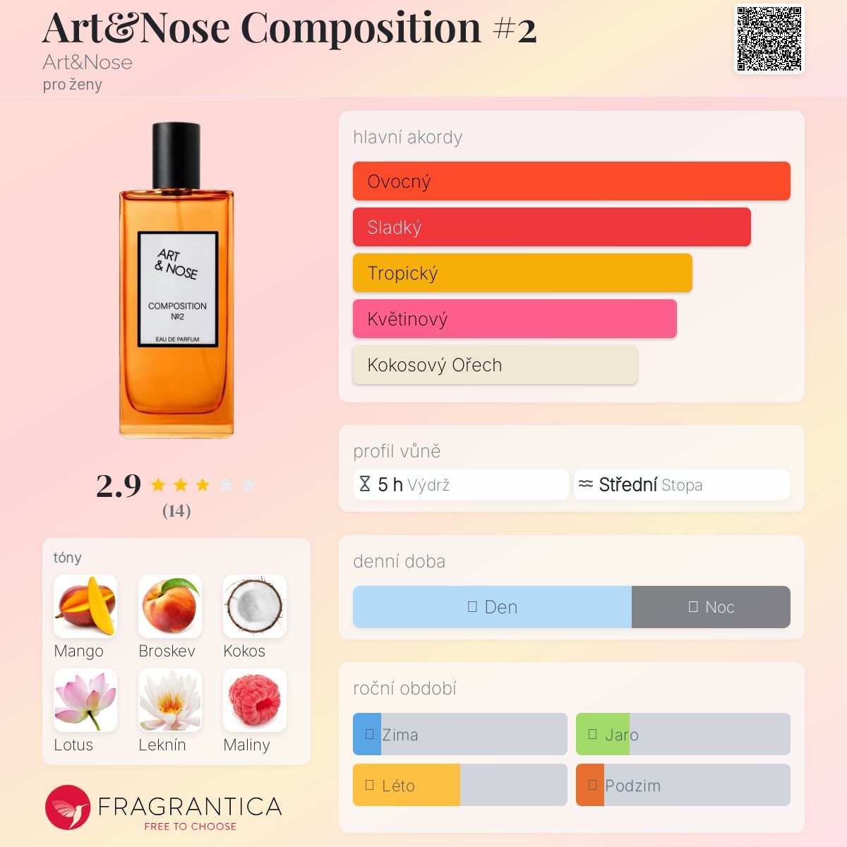 Art&Nose Composition #2 podle Art&Nose je Floral Fruity vůně pro ženy. Toto je nová vůně. Art&Nose Composition #2 byl/a uveden/a v roce 2024. Vrchní tóny jsou Mango, Broskev a Pomeranč; střední tóny jsouLotus, Leknín, Maliny a Květinové tóny ; základní tóny jsou Kokos, Santalové dřevo, Bílé pižmo a Jantar (ambra).