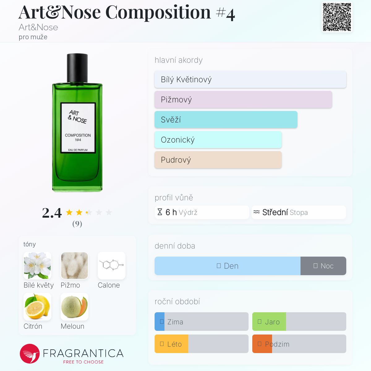 Art&Nose Composition #4 podle Art&Nose je Floral Aquatic vůně pro muže. Toto je nová vůně. Art&Nose Composition #4 byl/a uveden/a v roce 2024. Vrchní tóny jsou Citrón a Meloun; střední tóny jsouBílé květy a Calone ; základní tón je Pižmo.