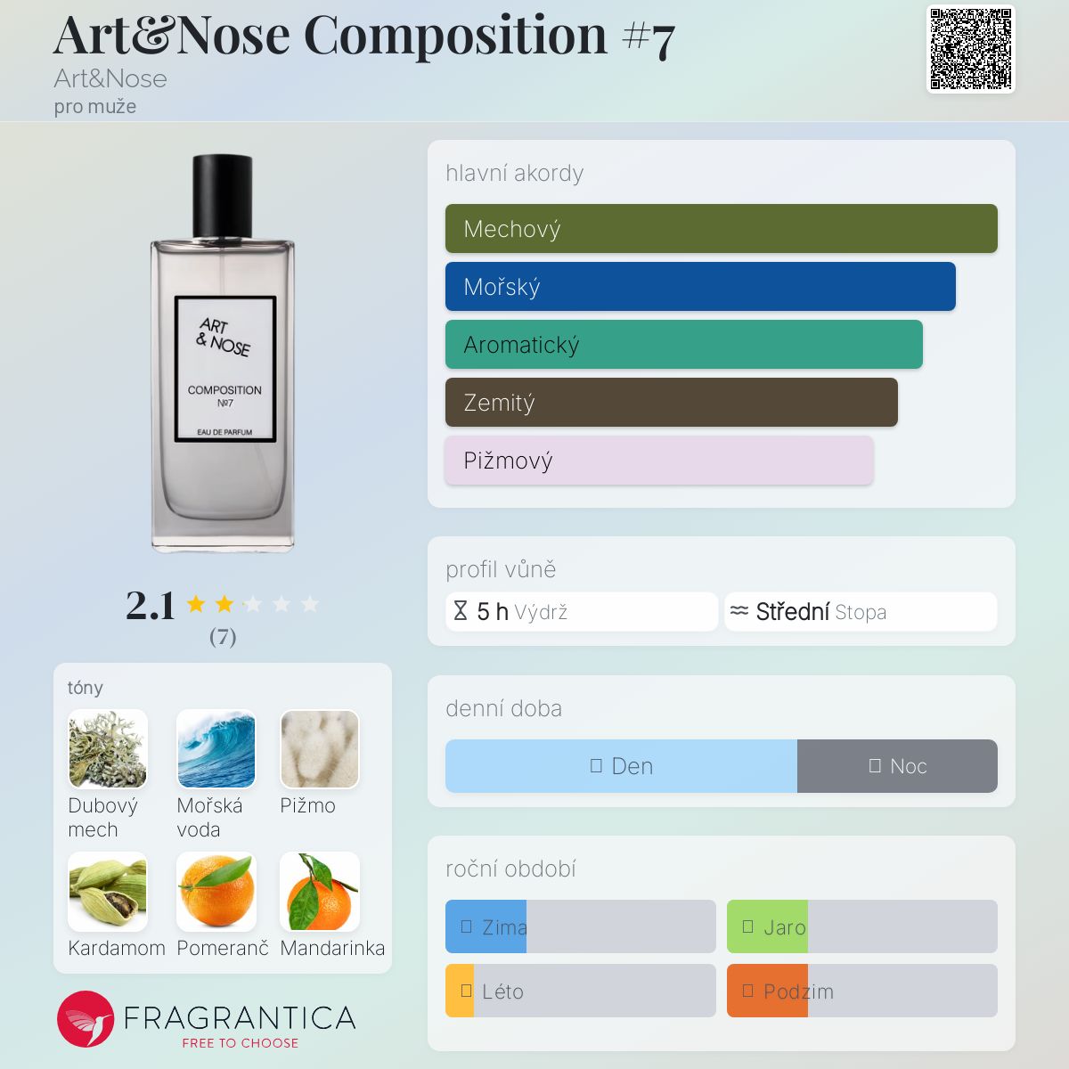Art&Nose Composition #7 podle Art&Nose je Woody Spicy vůně pro muže. Toto je nová vůně. Art&Nose Composition #7 byl/a uveden/a v roce 2024. Vrchní tóny jsou Pomeranč a Mandarinka; střední tóny jsouVodní tóny a Kardamom ; základní tóny jsou Dubový mech a Pižmo.