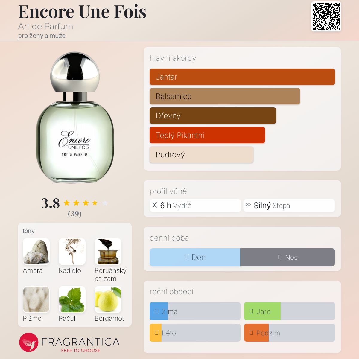 Encore Une Fois podle Art de Parfum je Floral Woody Musk vůně pro ženy a muže. Encore Une Fois byl/a uveden/a v roce 2019. Vrchní tóny jsou Bergamot a Pomerančový list; střední tóny jsouKadidlo, Fialka, Pivoňka, Konvalinka a Indický šafrán ; základní tóny jsou Ambra, Peruánský balzám, Bílé pižmo, Pačuli, Karamel, Cedr a Benzoin.