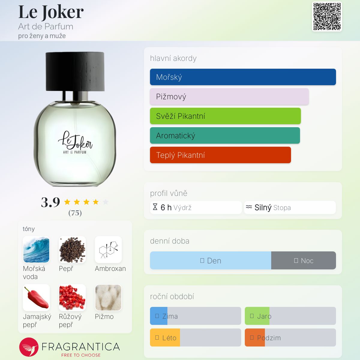 Le Joker podle Art de Parfum je Woody Spicy vůně pro ženy a muže. Le Joker byl/a uveden/a v roce 2020. Vrchní tóny jsou Černý pepř, Červená chilli paprička a Růžový pepř; střední tóny jsouMořské tóny, Badyán, Muškátový oříšek a Pudrové tóny ; základní tóny jsou Ambroxan, Pižmo, Mech, Atlasový cedr, Zvířecí tóny, Cypriolový olej a Pačuli.