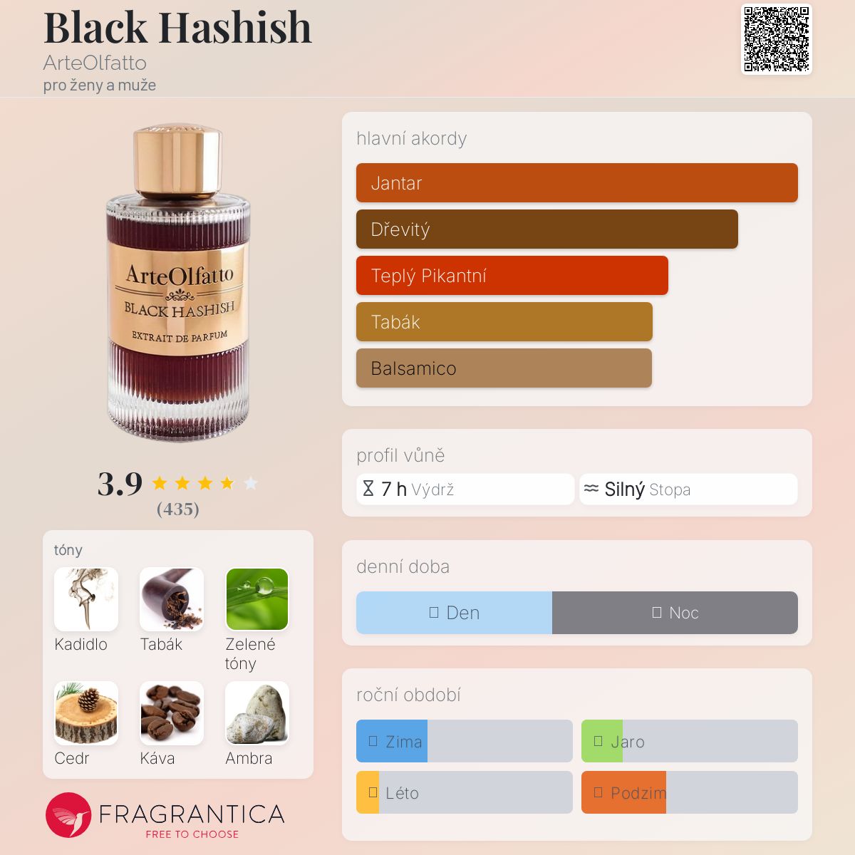 Black Hashish podle ArteOlfatto je Orientální vůně pro ženy a muže. Black Hashish byl/a uveden/a v roce 2013. Vrchní tóny jsou Kadidlo, Zelené tóny a Labdanum; střední tóny jsouTabák, Ambra a Fialka ; základní tóny jsou Cedr, Káva, Santalové dřevo, Labdanum a Pižmo.