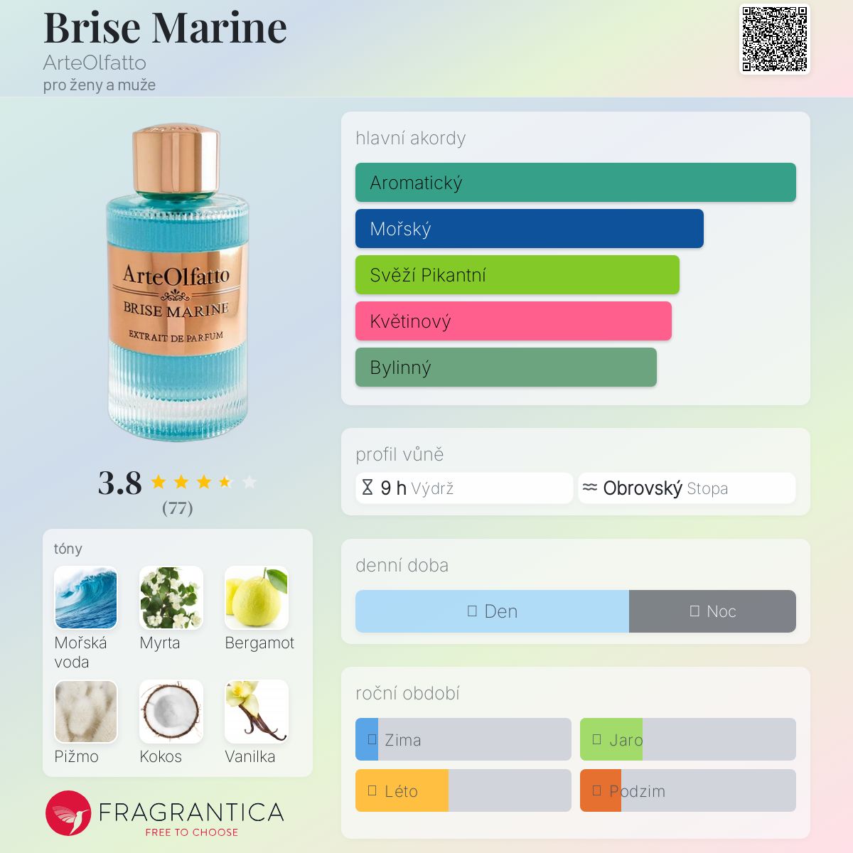 Brise Marine podle ArteOlfatto je Aromatic Aquatic vůně pro ženy a muže. Brise Marine byl/a uveden/a v roce 2013. Vrchní tóny jsou Mořské tóny, Myrta a Bergamot; střední tóny jsouKokos, Brambořík, Akát, Konvalinka a Ylang-Ylang ; základní tóny jsou Bílé pižmo, Vanilka a Pačuli.