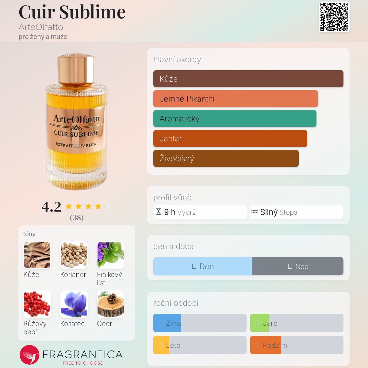 Cuir Sublime podle ArteOlfatto je Orientální Floral vůně pro ženy a muže. Toto je nová vůně. Cuir Sublime byl/a uveden/a v roce 2022. Vrchní tóny jsou Koriandr, Růžový pepř, Grapefruit a Mandarinka; střední tóny jsouFialkový list, Kosatec, Růže, Jasmín a Květ tiare ; základní tóny jsou Kůže, Cedr, Jantar (ambra), Benzoin, Vanilka, Myrha a Pižmo.