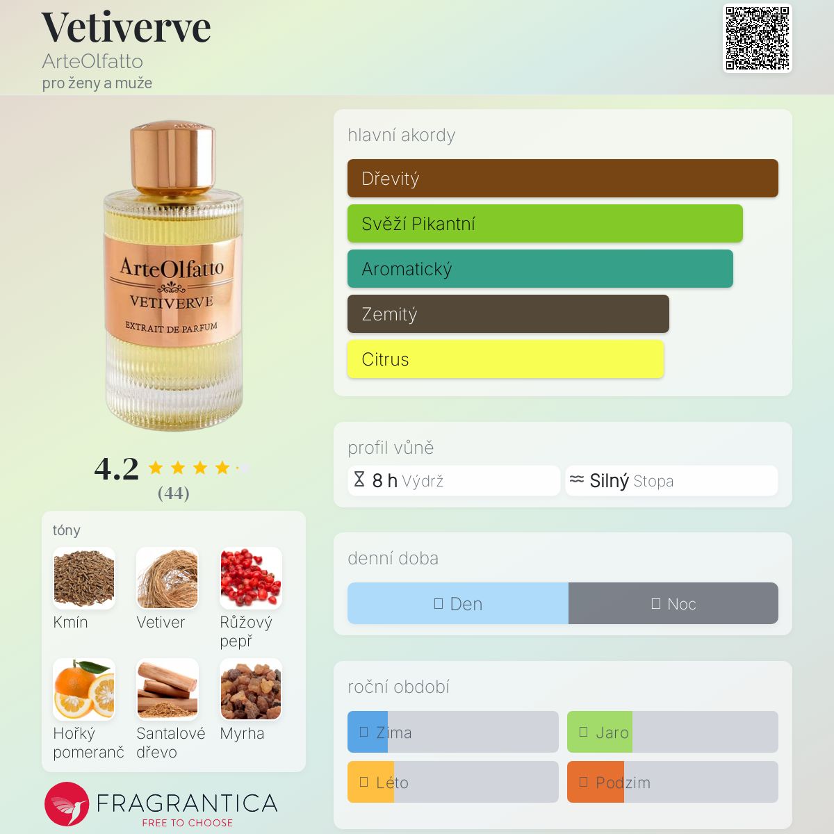 Vetiverve podle ArteOlfatto je Woody Spicy vůně pro ženy a muže. Vetiverve byl/a uveden/a v roce 2019. Vrchní tóny jsou Hořký pomeranč a Bergamot; střední tóny jsouKmín, Růžový pepř a Karafiát ; základní tóny jsou Haitský vetiver, Santalové dřevo, Myrha a Pižmo.