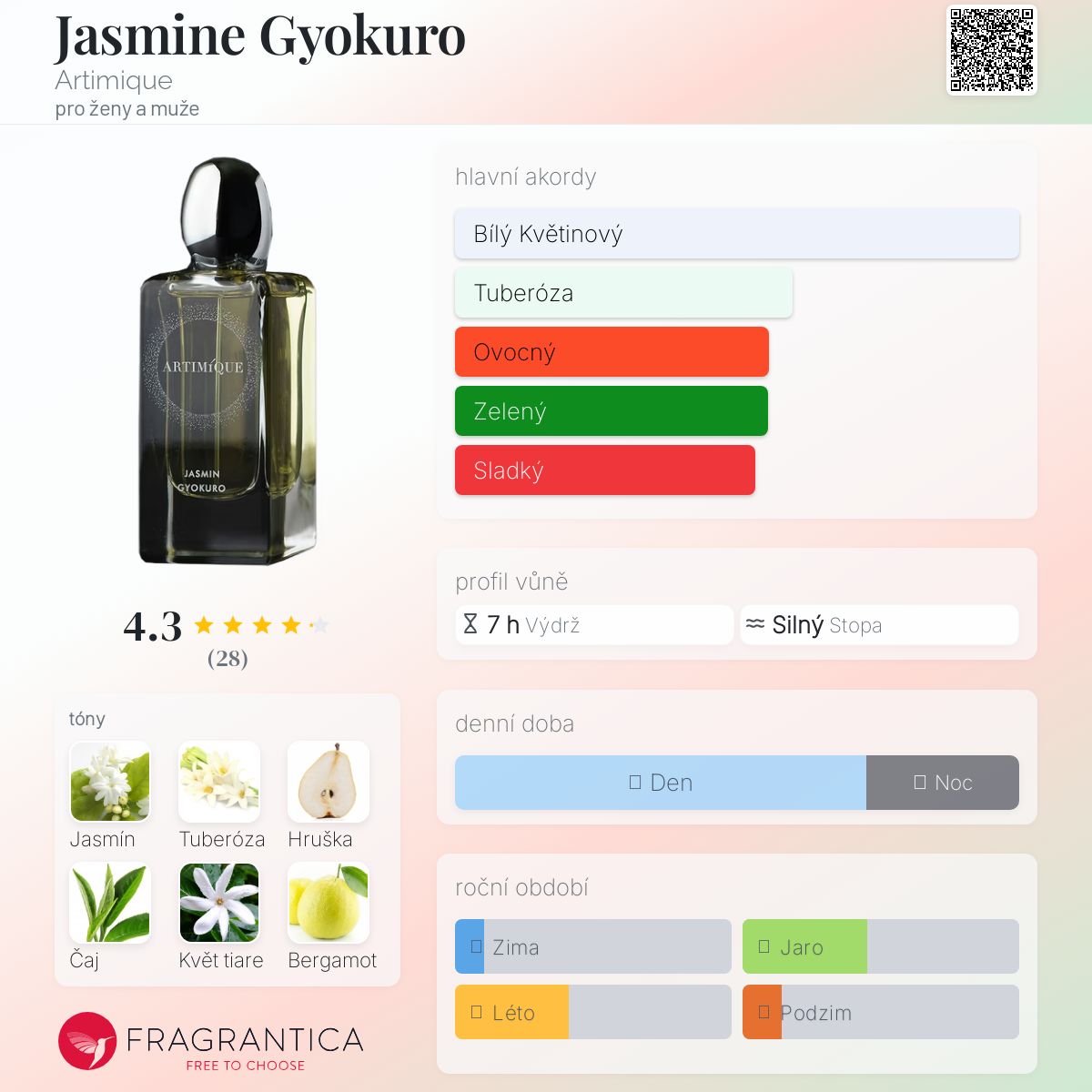 Jasmine Gyokuro podle Artimique je Floral vůně pro ženy a muže. Jasmine Gyokuro byl/a uveden/a v roce 2023. "Nosem" za touto vůní je Cristiano Canali. Vrchní tóny jsou Hruška, Zelený čaj a Kalábrijský bergamot; střední tóny jsouJasmín Sambac, Tuberóza, Květ tahitské gardénie a Mimóza ; základní tóny jsou Bílé pižmo, Vetiver a Andělika.