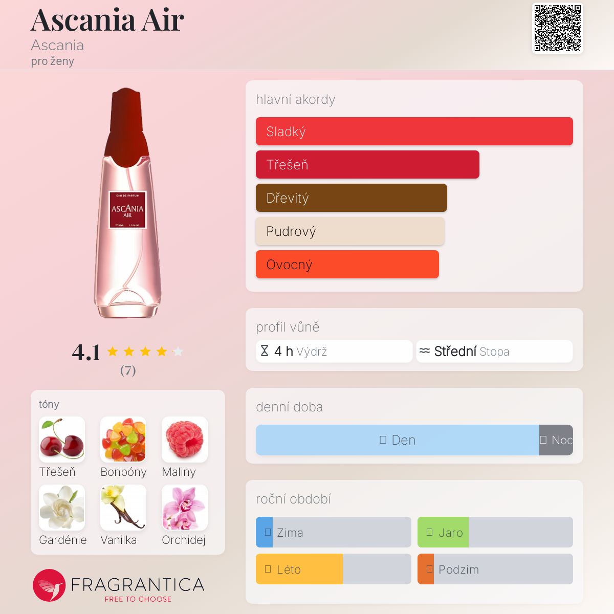 Ascania Air podle Ascania je Floral Woody Musk vůně pro ženy. Ascania Air byl/a uveden/a v roce 2015. Vrchní tóny jsou Třešeň a Maliny; střední tóny jsouSladké tóny, Gardénie, Vanilka a Orchidej ; základní tóny jsou Pižmo, Semiš, Santalové dřevo a Dub.