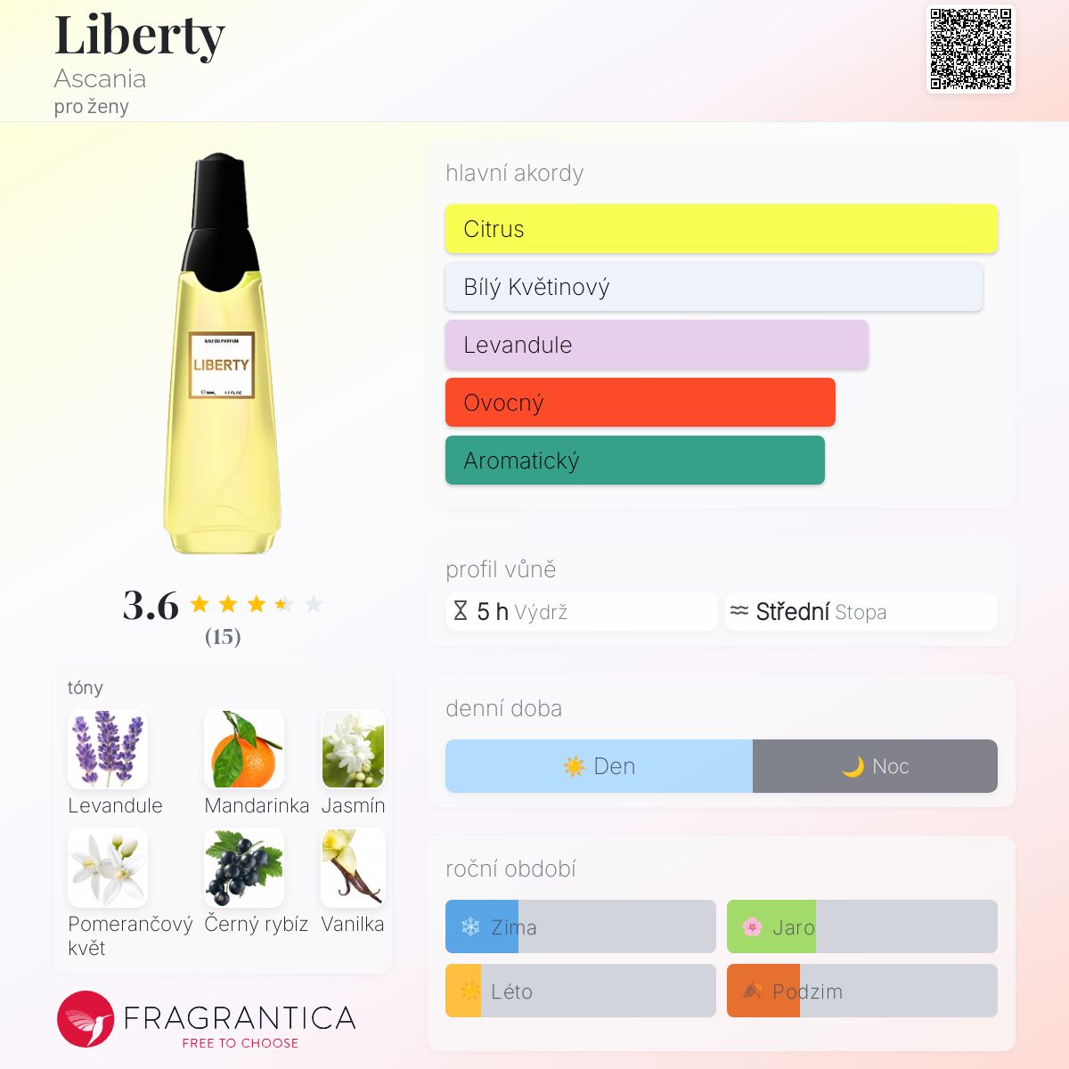 Liberty podle Ascania je Woody Aromatic vůně pro ženy. Liberty byl/a uveden/a v roce 2021. Vrchní tóny jsou Levandule, Mandarinka, Černý rybíz a Petitgrain; střední tóny jsouLevandule, Jasmín a Pomerančový květ ; základní tóny jsou Madagaskarská vanilka, Jantar (ambra), Cedr a Pižmo.