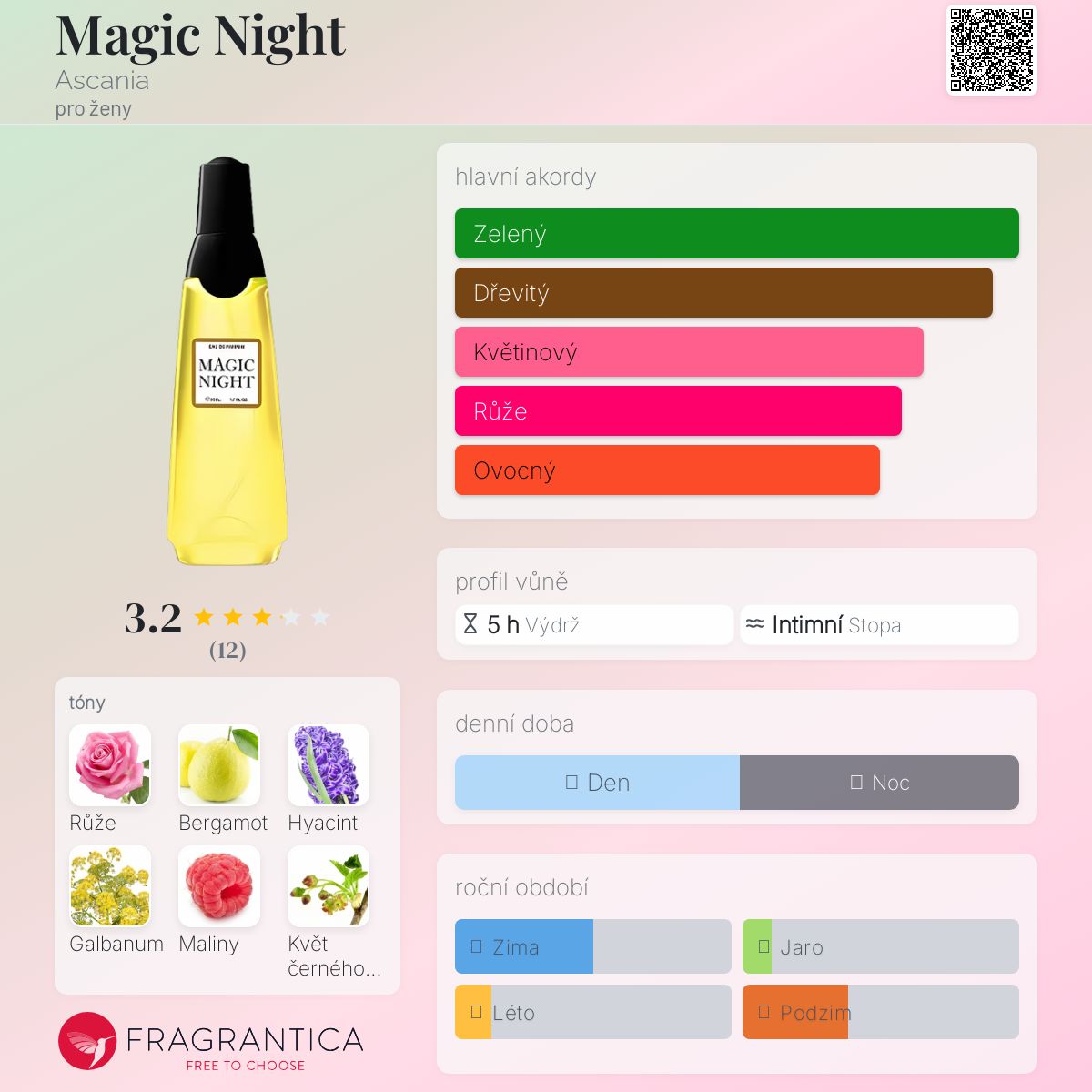 Magic Night podle Ascania je Floral vůně pro ženy. Magic Night byl/a uveden/a v roce 2004. Vrchní tóny jsou Bulharská růže, Bergamot, Hyacint, Galbanum, Maliny, Květ černého rybízu a List černého rybízu; střední tóny jsouNarcis, Cedr, Konvalinka, Ylang-Ylang, Tuberóza a Med ; základní tóny jsou Pačuli, Dubový mech, Pižmo, Santalové dřevo, Koření a Vetiver.