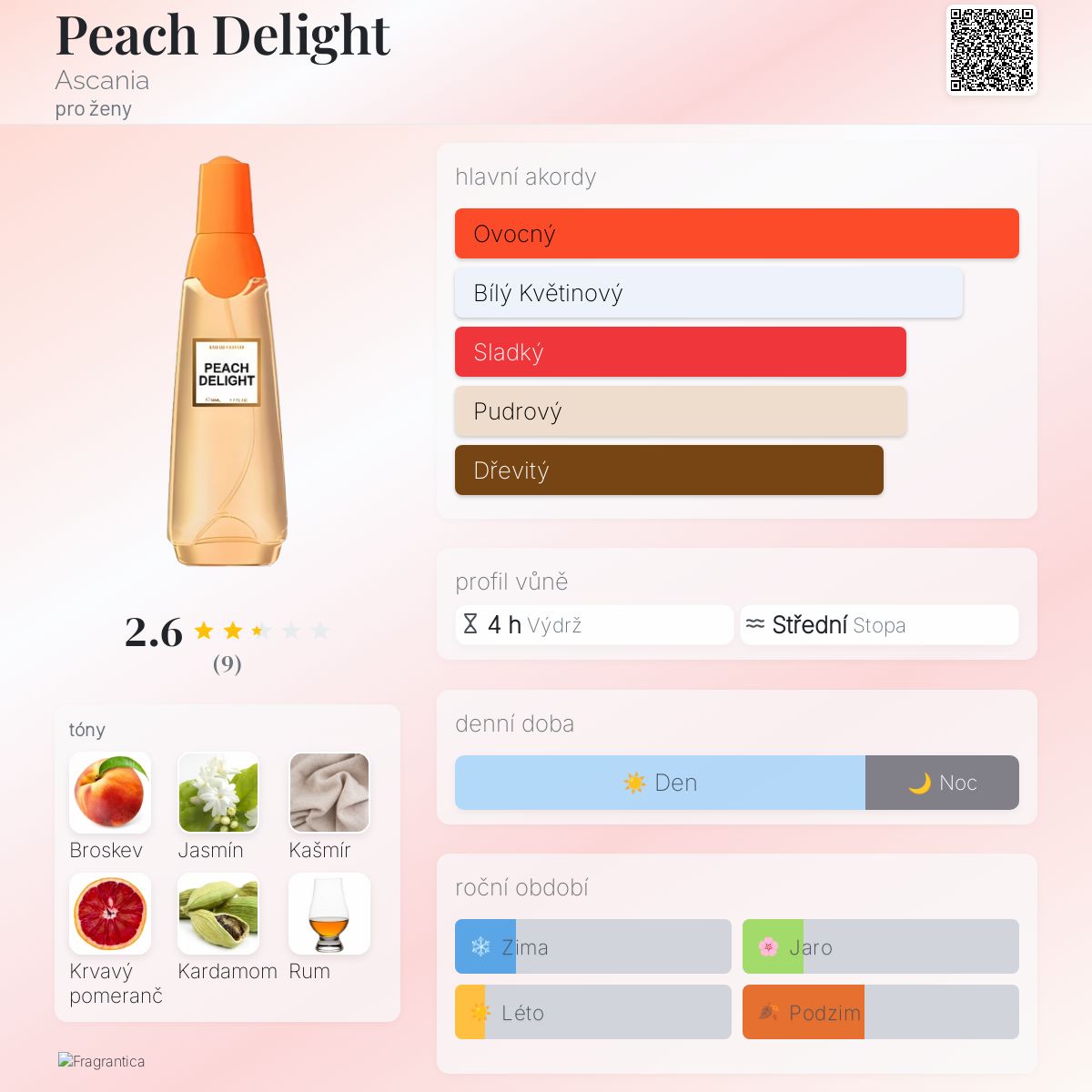 Peach Delight podle Ascania je Floral Fruity vůně pro ženy. Peach Delight byl/a uveden/a v roce 2021. Vrchní tóny jsou Broskev, Krvavý pomeranč a Kardamom; střední tóny jsouJasmín, Rum a Davana ; základní tóny jsou Kašmír, Fazole tonka, Vanilka a Pačuli.