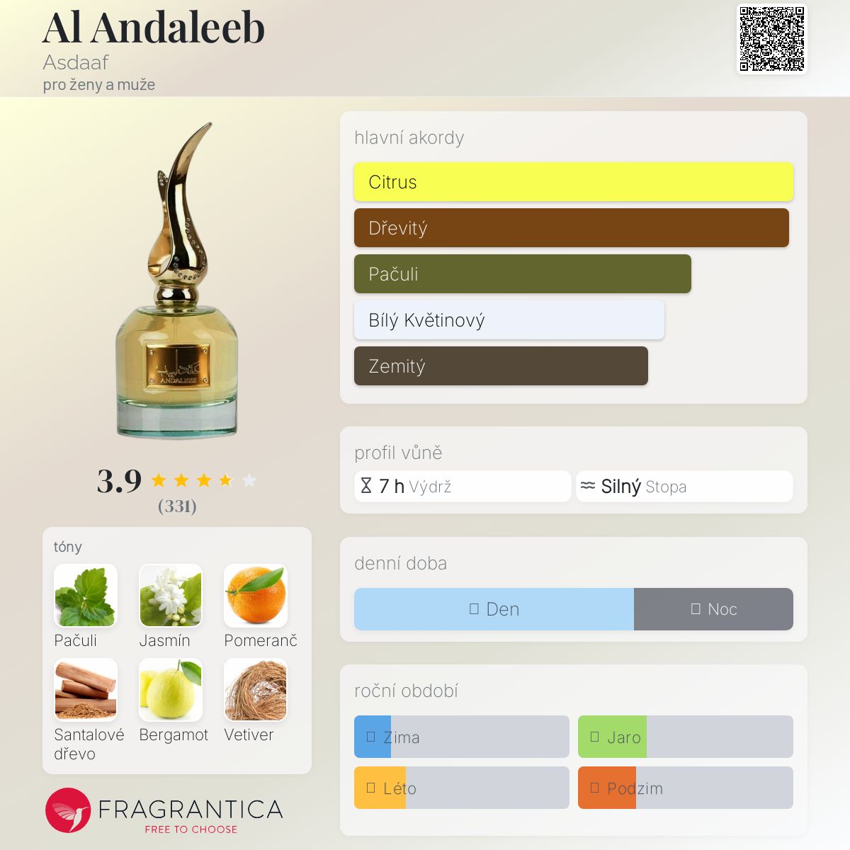 Al Andaleeb podle Asdaaf je Chypre Floral vůně pro ženy a muže. Vrchní tóny jsou Pomeranč, Bergamot a Mandarinka; střední tóny jsouJasmín a Růže ; základní tóny jsou Pačuli, Santalové dřevo a Vetiver.