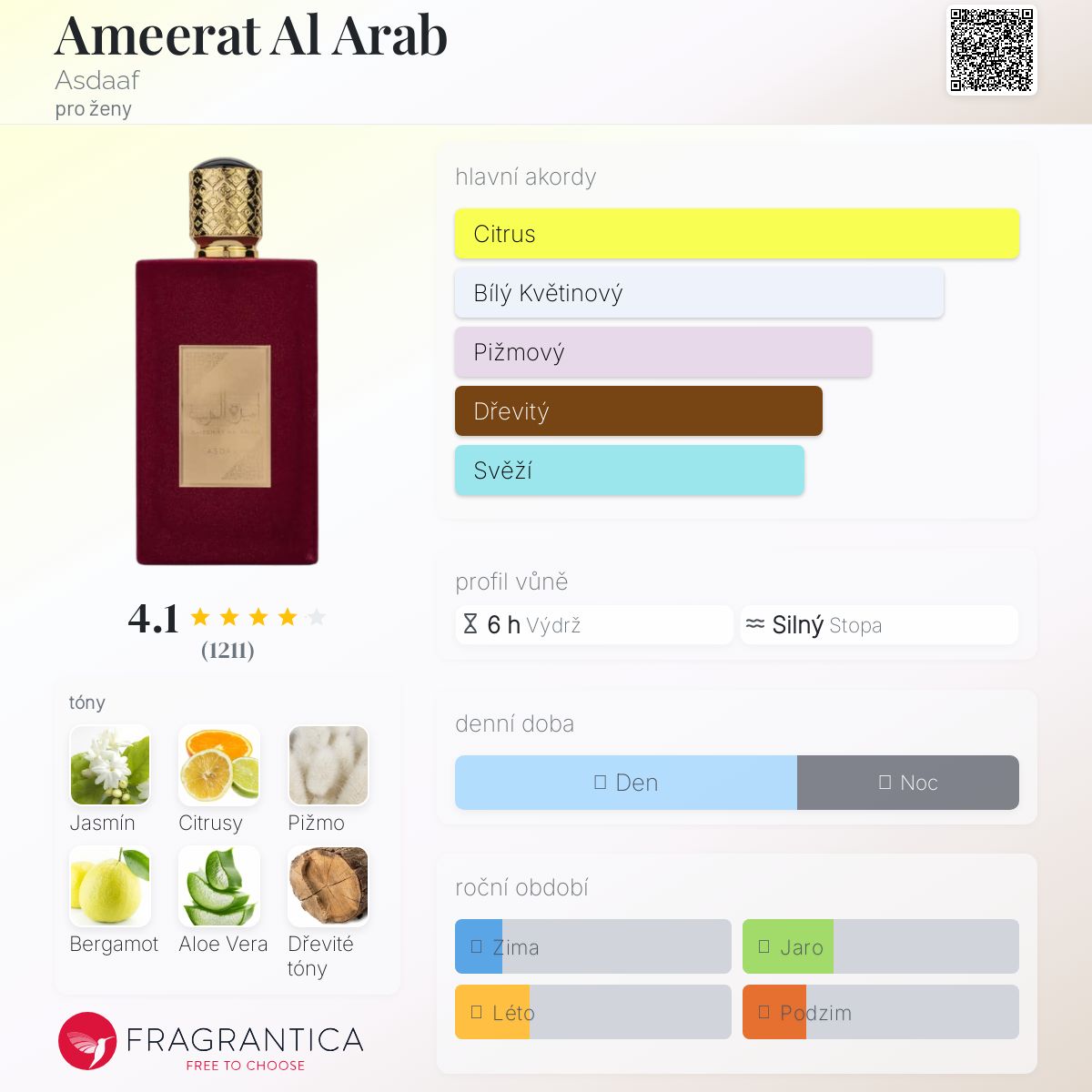 Ameerat Al Arab podle Asdaaf je Floral vůně pro ženy. Ameerat Al Arab byl/a uveden/a v roce 2022. Vrchní tóny jsou Citrusy a Bergamot; střední tóny jsouBílé pižmo a Aloe Vera ; základní tóny jsou Jasmín, Pižmo, Dřevité tóny a Agarové dřevo (oud).