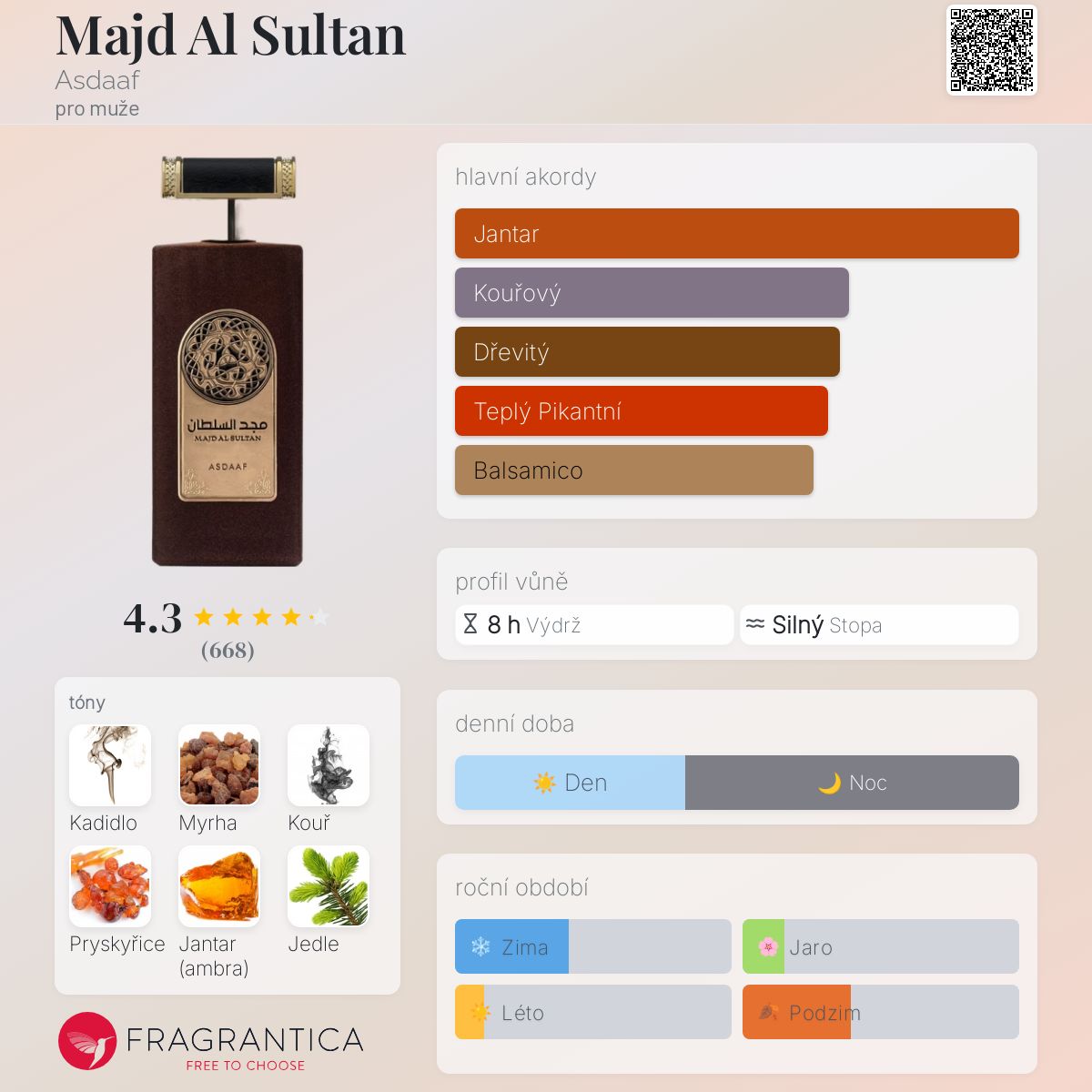 Majd Al Sultan podle Asdaaf je Orientální Spicy vůně pro muže. Majd Al Sultan byl/a uveden/a v roce 2020. Vrchní tóny jsou Kouř a Tabák; střední tóny jsouKadidlo, Myrha, Pepř a Šafrán ; základní tóny jsou Pryskyřice, Jantar (ambra), Jedle a Cedr.