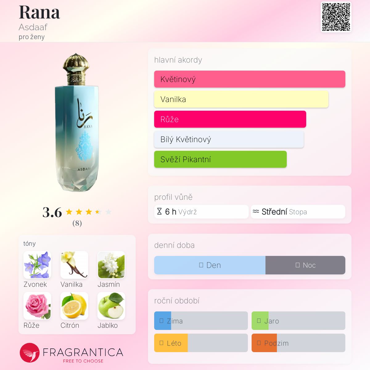 Rana podle Asdaaf je Floral vůně pro ženy. Toto je nová vůně. Rana byl/a uveden/a v roce 2025. Vrchní tóny jsou Zvonek a Sicilský citron; střední tóny jsouJasmín, Růže a Jablko ; základní tóny jsou Vanilka, Jantar (ambra) a Cedr.