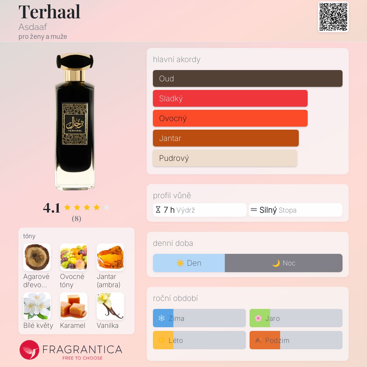 Terhaal podle Asdaaf je Floral Fruity vůně pro ženy a muže. Toto je nová vůně. Terhaal byl/a uveden/a v roce 2022. Vrchní tóny jsou Ovoce a Citrusy; střední tóny jsouBílé květy a Karamel ; základní tóny jsou Agarové dřevo (oud), Jantar (ambra), Vanilka, Santalové dřevo a Pižmo.