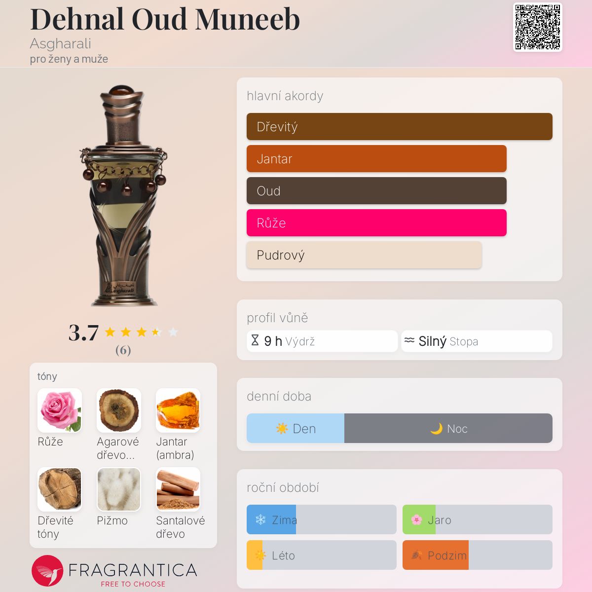 Dehnal Oud Muneeb podle Asgharali je Citrus Aromatic vůně pro ženy a muže. Dehnal Oud Muneeb byl/a uveden/a v roce 2013. Vrchní tóny jsou Růže a Citrusy; střední tóny jsouAgarové dřevo (oud), Jantar (ambra) a Dřevité tóny ; základní tóny jsou Pižmo a Santalové dřevo.