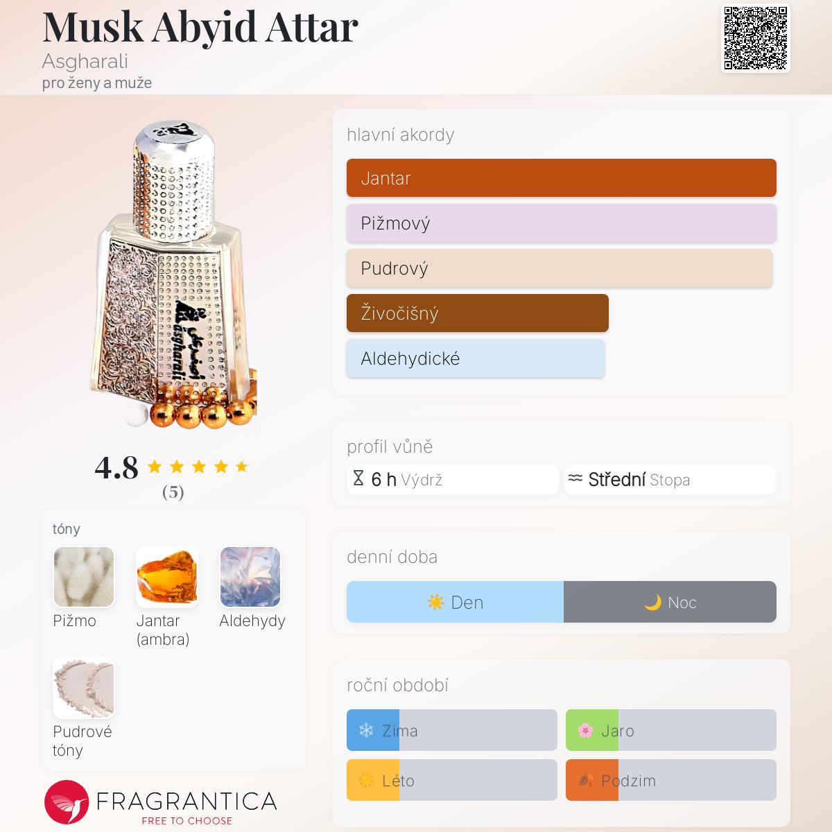Musk Abyid Attar podle Asgharali je Orientální vůně pro ženy a muže. Vrchní tóny jsou Pižmo a Jantar (ambra); střední tóny jsouPižmo, Jantar (ambra) a Aldehydy ; základní tóny jsou Pižmo a Pudrové tóny.