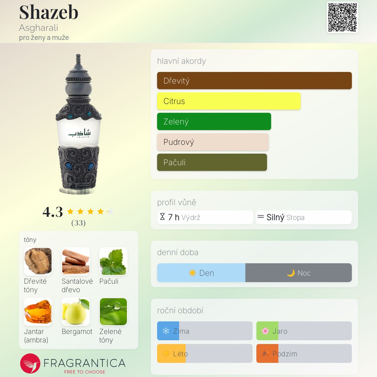Shazeb podle Asgharali je Woody Chypre vůně pro ženy a muže. Vrchní tóny jsou Bergamot, Zelené tóny, Limetka a Mandarinka; střední tóny jsouSantalové dřevo, Pačuli, Jantar (ambra), Cypriolový olej, Květinové tóny a Ovocné tóny ; základní tóny jsou Dřevité tóny, Jantar (ambra) a Pižmo.