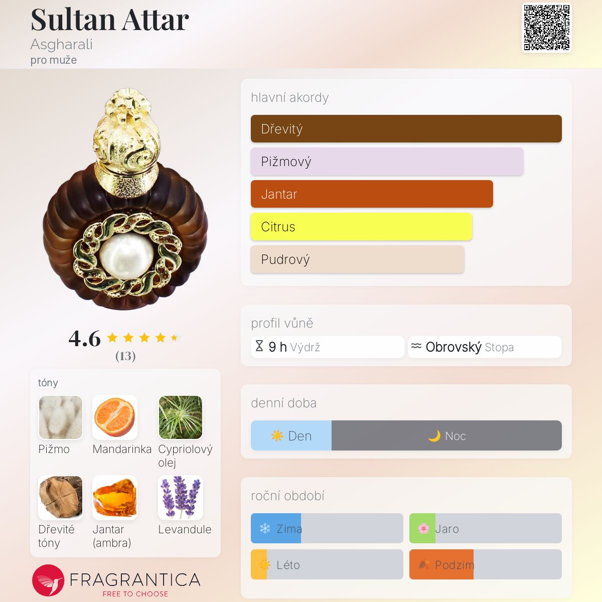 Sultan Attar podle Asgharali je Woody Aromatic vůně pro muže. Vrchní tóny jsou Mandarinka, Levandule, Orientální tóny, Limetka a Bergamot; střední tóny jsouCypriolový olej, Jantar (ambra), Ovocné tóny, Santalové dřevo, Pačuli a Květinové tóny ; základní tóny jsou Pižmo, Dřevité tóny a Jantar (ambra).