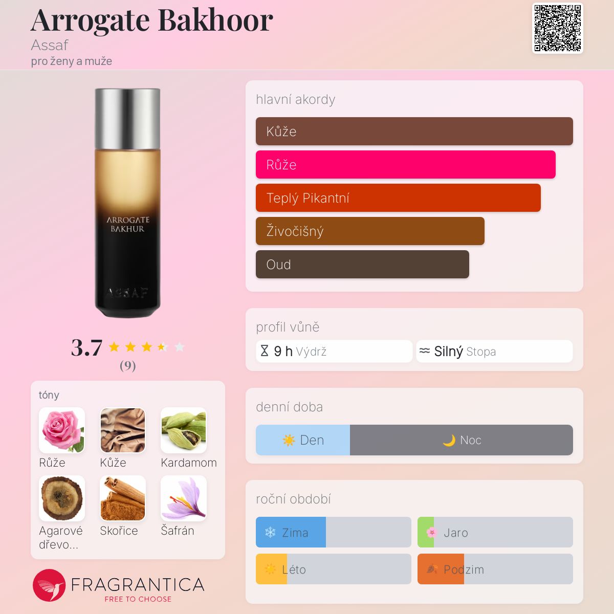 Arrogate Bakhoor podle Assaf je Orientální Woody vůně pro ženy a muže. Toto je nová vůně. Arrogate Bakhoor byl/a uveden/a v roce 2025. Vrchní tóny jsou Kardamom, Skořice a Šafrán; střední tóny jsouRůže, Agarové dřevo (oud) a Cedr ; základní tóny jsou Kůže, Jantar (ambra) a Pižmo.