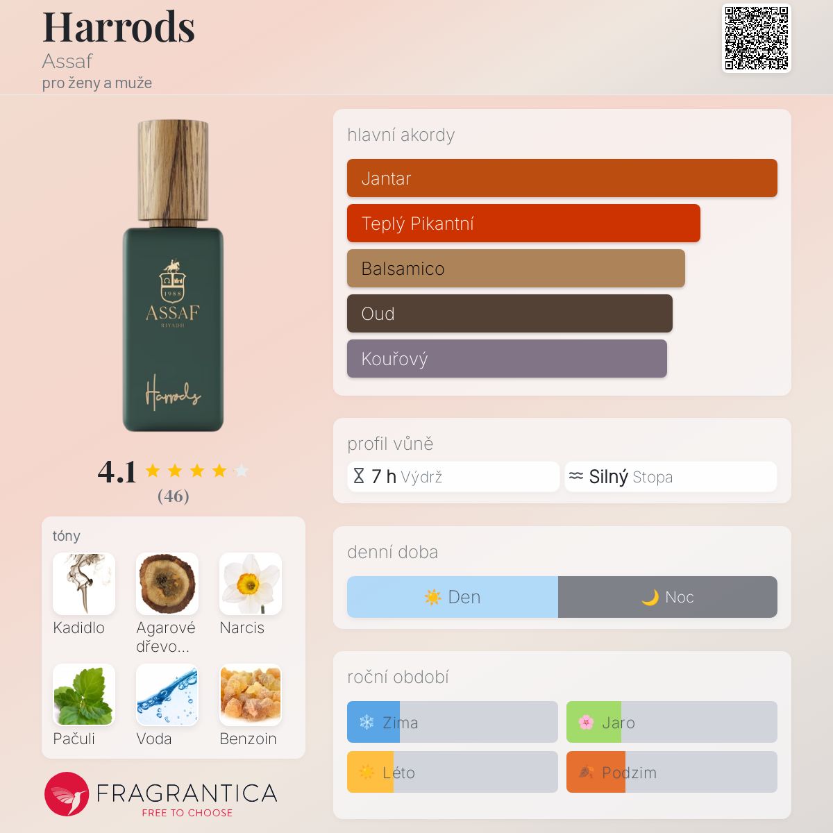 Harrods podle Assaf je Orientální Floral vůně pro ženy a muže. Harrods byl/a uveden/a v roce 2022. "Nosem" za touto vůní je Dominique Moellhausen. Vrchní tóny jsou Vodnaté tóny a Sirup z černého rybízu; střední tóny jsouNarcis, Růže, Jasmín Sambac a Brambořík ; základní tóny jsou Kadidlo, Agarové dřevo (oud), Pačuli a Benzoin.