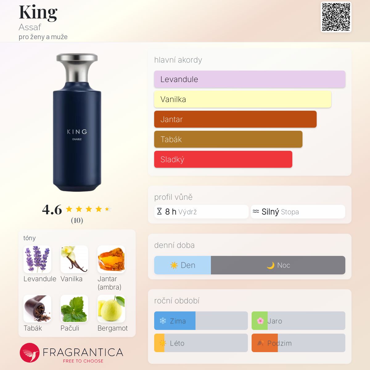 King podle Assaf je Orientální vůně pro ženy a muže. King byl/a uveden/a v roce 2023. Vrchní tóny jsou Levandule a Bergamot; střední tóny jsouJantar (ambra) a Pačuli ; základní tóny jsou Vanilka a Tabák.