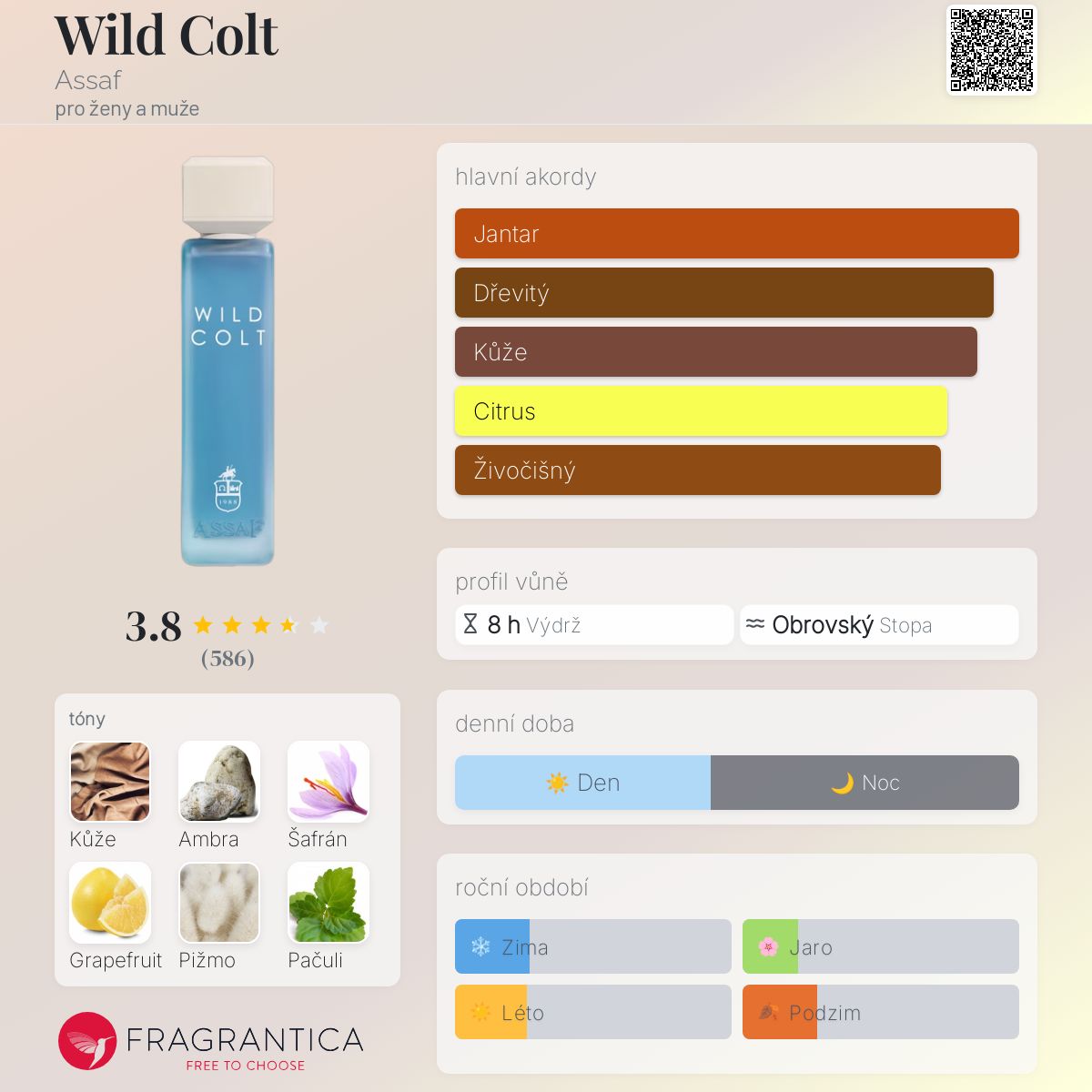 Wild Colt podle Assaf je Orientální Woody vůně pro ženy a muže. Wild Colt byl/a uveden/a v roce 2022. Vrchní tóny jsou Šafrán, Grapefruit, Růžový pepř, Máta a Bergamot; střední tóny jsouKůže, Pačuli, Vetiver a Labdanum ; základní tóny jsou Ambra, Pižmo, Dubový mech a Jantarové dřevo.