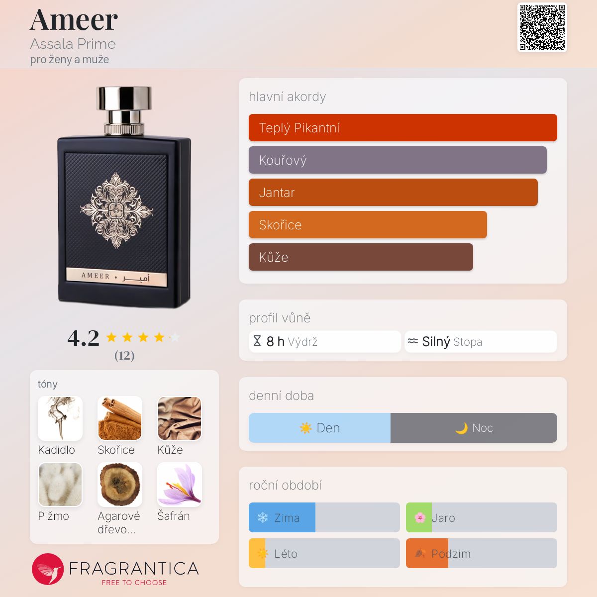 Ameer podle Assala Prime je Leather vůně pro ženy a muže. Toto je nová vůně. Ameer byl/a uveden/a v roce 2024. Vrchní tóny jsou Skořice, Šafrán a Muškátový oříšek; střední tóny jsouKadidlo a Kůže ; základní tóny jsou Pižmo, Agarové dřevo (oud) a Cypriolový olej.