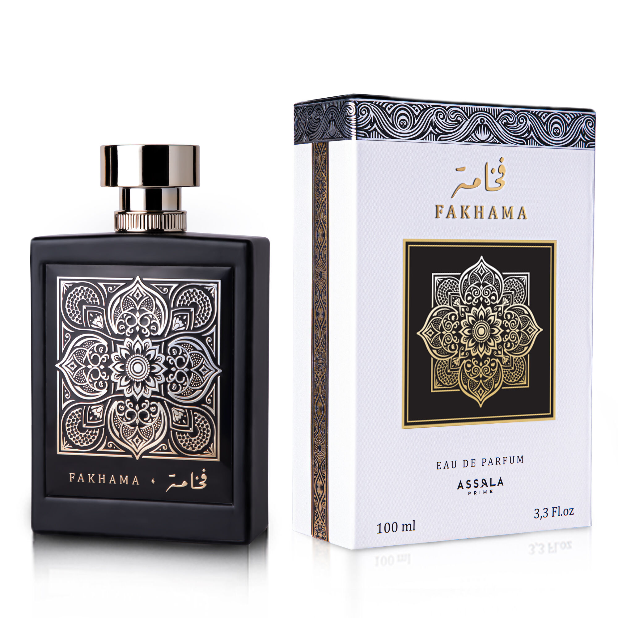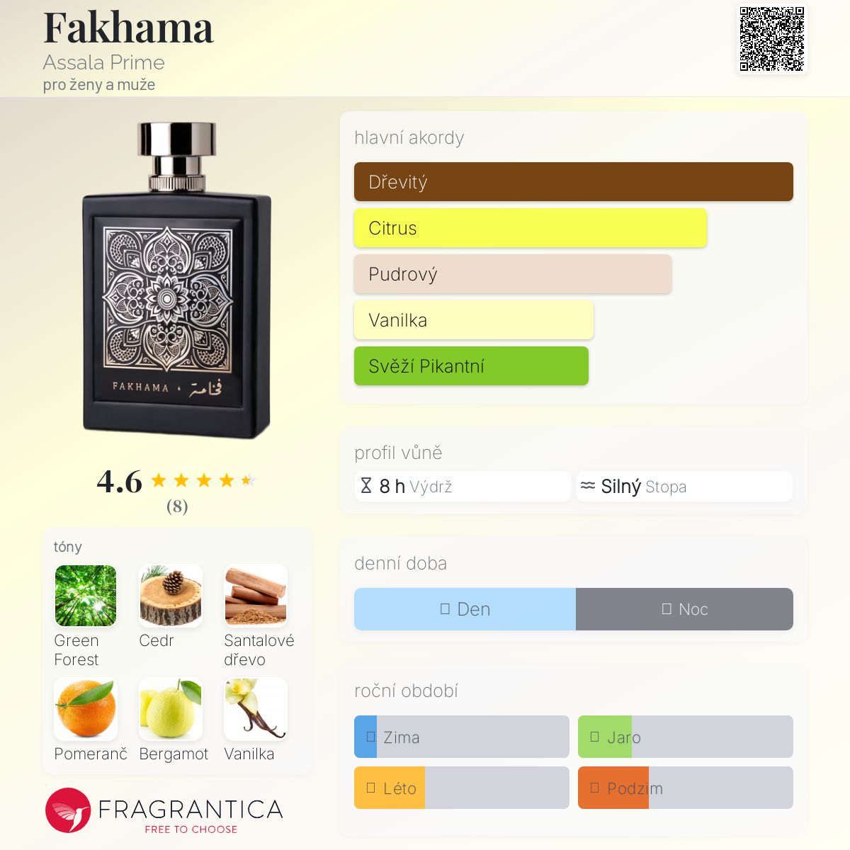 Fakhama podle Assala Prime je Floral Woody Musk vůně pro ženy a muže. Toto je nová vůně. Fakhama byl/a uveden/a v roce 2024. Vrchní tóny jsou Pomeranč a Bergamot; střední tóny jsouZelený les a Cedr ; základní tóny jsou Santalové dřevo, Vanilka a Pižmo.