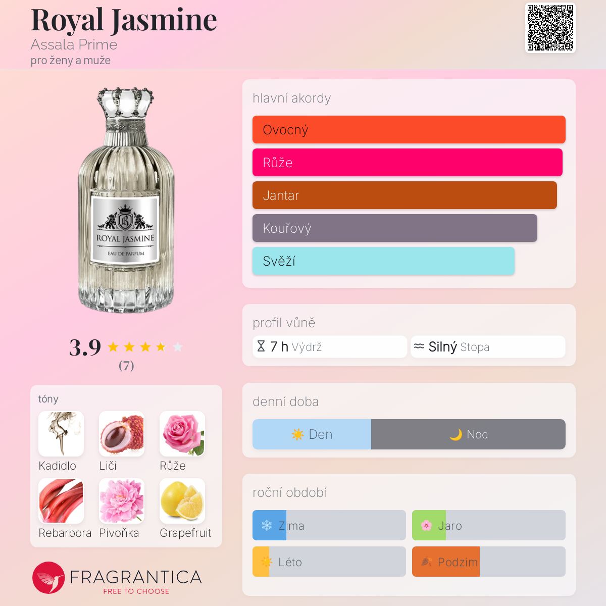 Royal Jasmine podle Assala Prime je Floral vůně pro ženy a muže. Toto je nová vůně. Royal Jasmine byl/a uveden/a v roce 2024. Vrchní tóny jsou Liči, Rebarbora a Grapefruit; střední tóny jsouRůže, Pivoňka a Vetiver ; základní tóny jsou Kadidlo, Vanilka, Pižmo a Dubový mech.