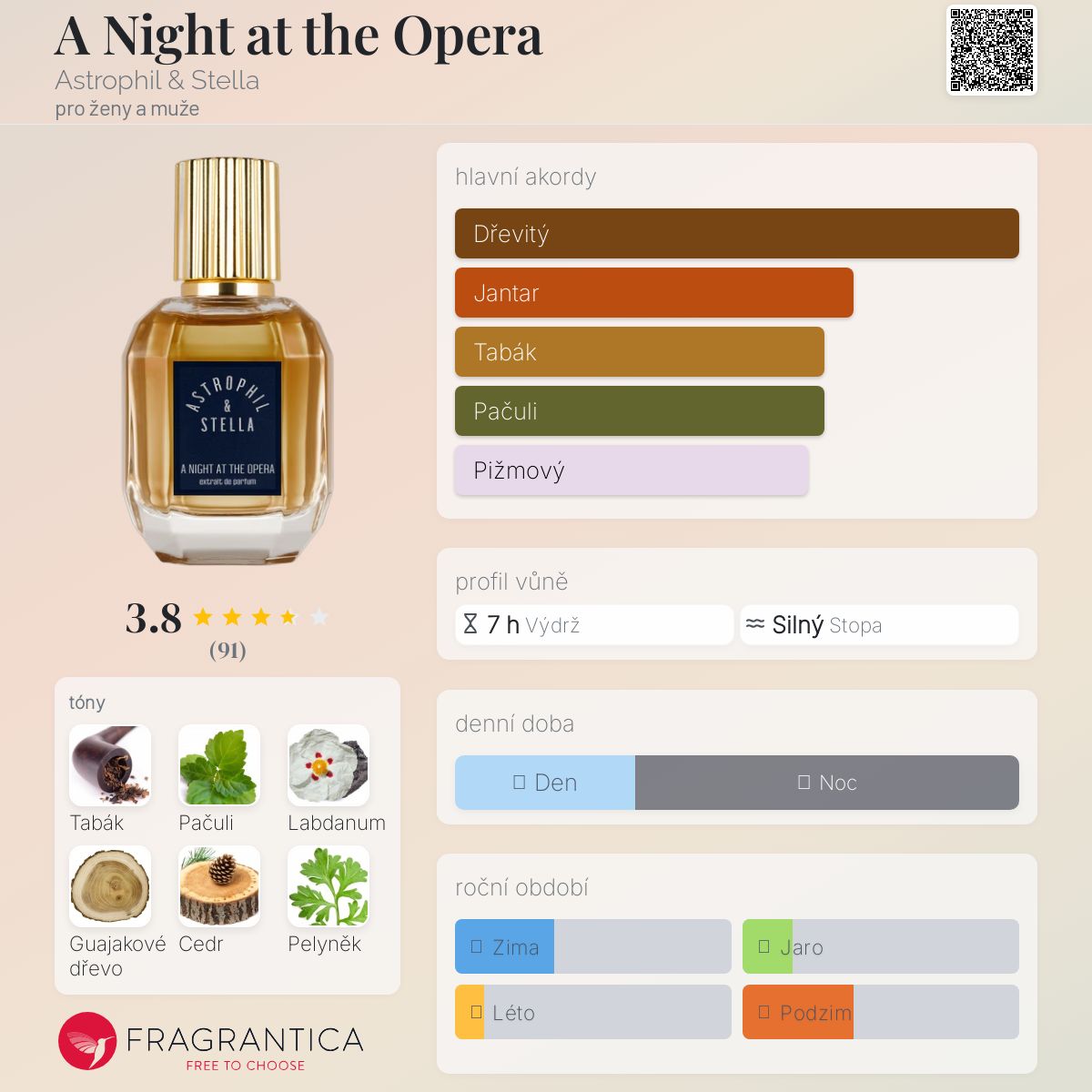 A Night at the Opera podle Astrophil & Stella je vůně pro ženy a muže. A Night at the Opera byl/a uveden/a v roce 2021. "Nosem" za touto vůní je Luca Maffei. Vrchní tóny jsou Labdanum, Pelyněk, Tomka vonná a Bergamot; střední tóny jsouTabák a Kůže ; základní tóny jsou Pačuli, Guajakové dřevo, Virginský cedr, Kašmír, Jantar (ambra) a Pižmo.