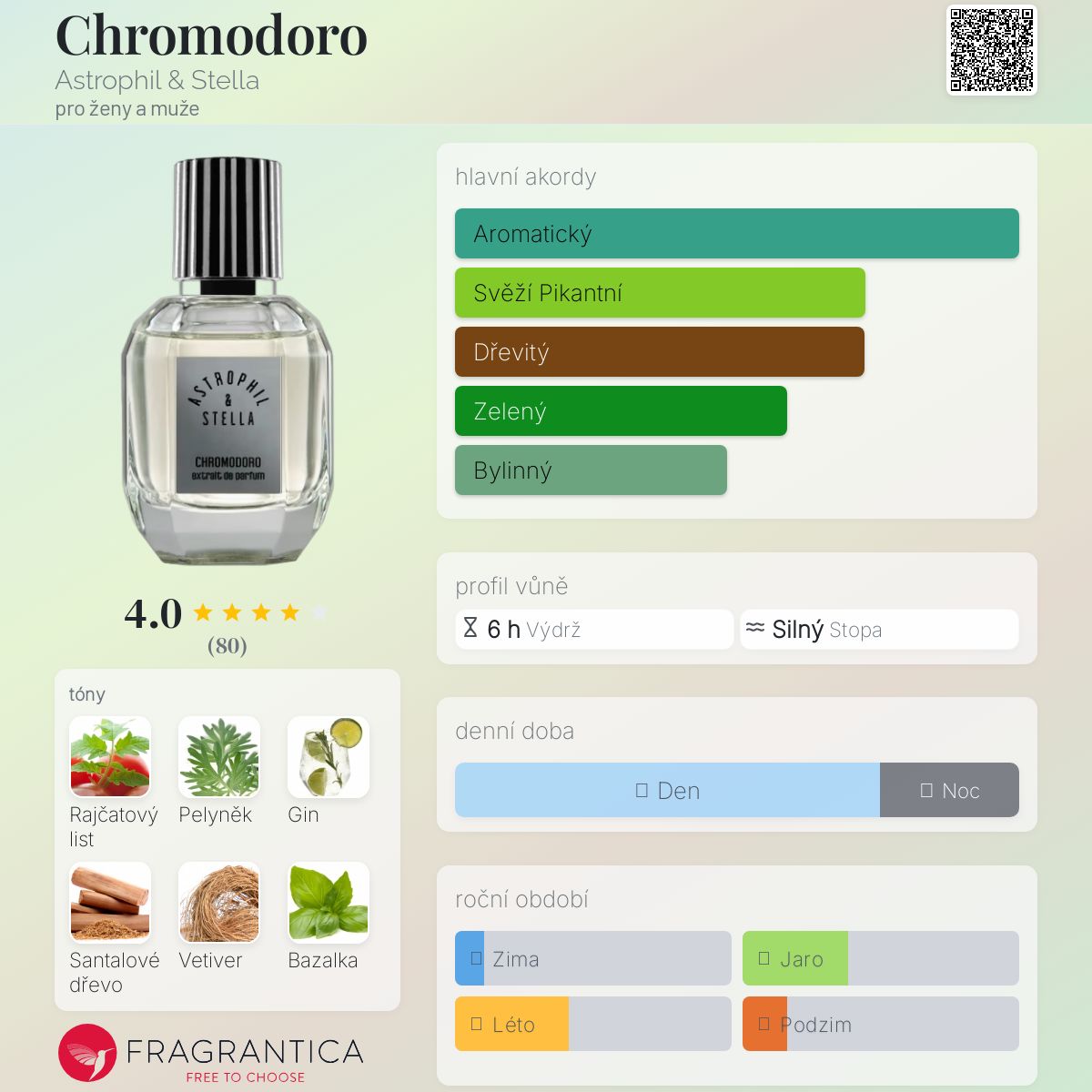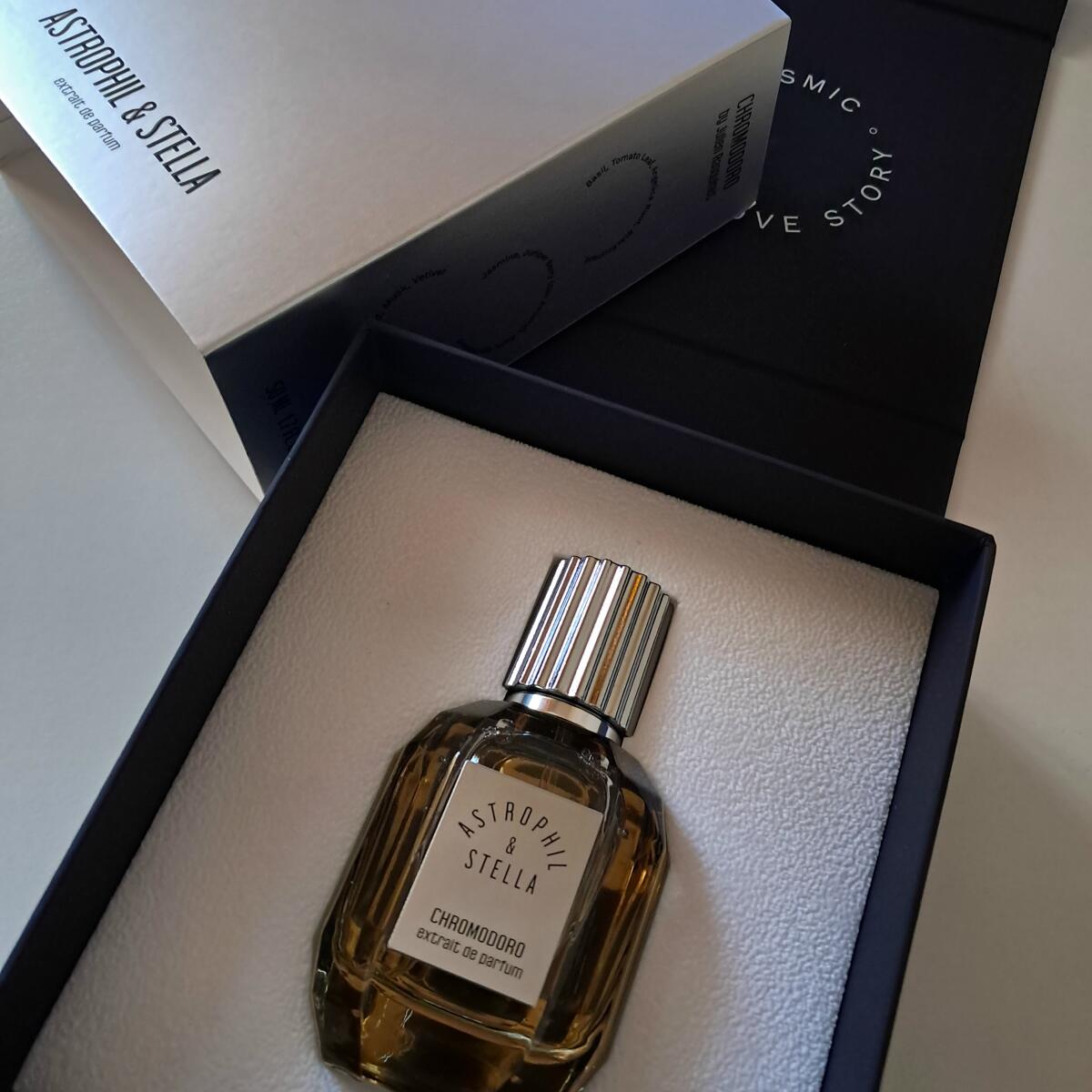 Chromodoro podle Astrophil & Stella je Aromatic Green vůně pro ženy a muže. Toto je nová vůně. Chromodoro byl/a uveden/a v roce 2025. "Nosem" za touto vůní je Julien Rasquinet. Vrchní tóny jsou Rajčatový list, Bazalka, Kořen anděliky a Černý rybíz; střední tóny jsouPelyněk, Gin, Jalovcové bobulky, Rum a Egyptský jasmín ; základní tóny jsou Santalové dřevo, Vetiver a Pižmo.