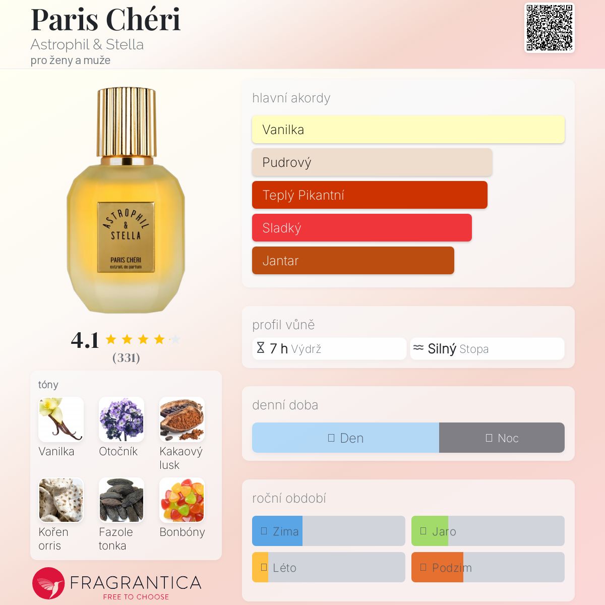 Paris Chéri podle Astrophil & Stella je vůně pro ženy a muže. Paris Chéri byl/a uveden/a v roce 2021. "Nosem" za touto vůní je Nathalie Feisthauer. Vrchní tóny jsou Kardamom, List skořice, Růžový pepř a Bergamot; střední tóny jsouOtočník, Kakao, Orris, Káva, Hedione a Konvalinka ; základní tóny jsou Vanilka, Fazole tonka, Sladké tóny, Ambrette (přírodní pižmo), Ambroxan, Benzoin, Španělské labdanum, Dřevité tóny a Cedr.