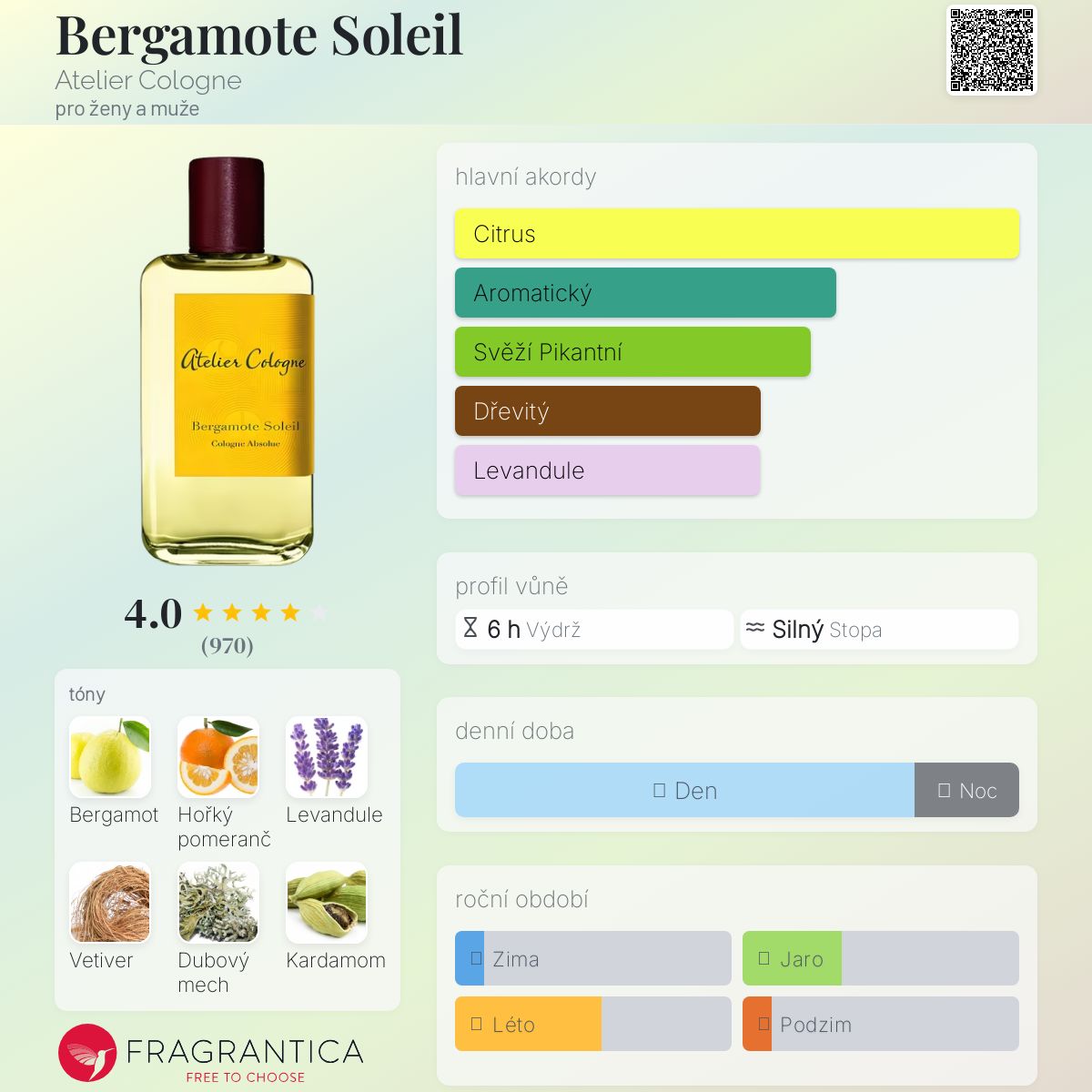 Bergamote Soleil podle Atelier Cologne je Citrus Aromatic vůně pro ženy a muže. Bergamote Soleil byl/a uveden/a v roce 2016. Vrchní tóny jsou Kalábrijský bergamot, Hořký pomeranč a Ambrette (přírodní pižmo); střední tóny jsouLevandule, Guatemalský kardamom a Egyptský jasmín ; základní tóny jsou Haitský vetiver, Dubový mech a Bílý jantar (ambra).