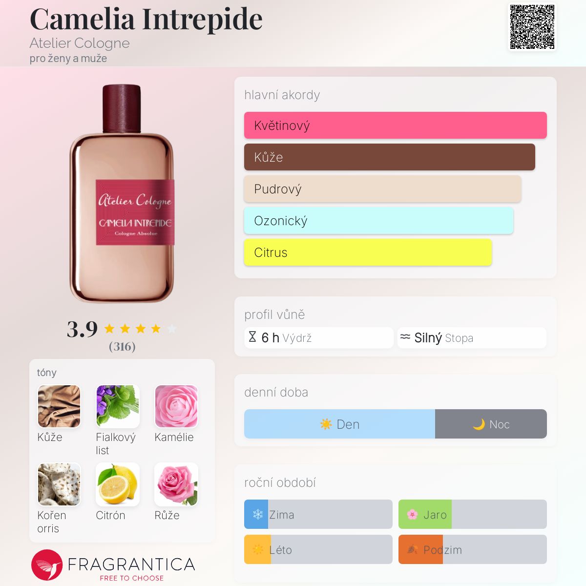 Camelia Intrepide podle Atelier Cologne je vůně pro ženy a muže. Camelia Intrepide byl/a uveden/a v roce 2016. "Nosem" za touto vůní je Jérôme Epinette. Vrchní tóny jsou Sicilský citron, Kalábrijský bergamot a Muškátový oříšek; střední tóny jsouFialkový list, Kamélie a Kořen orris ; základní tóny jsou Kůže, Turecký růžový olej a Jantar (ambra).