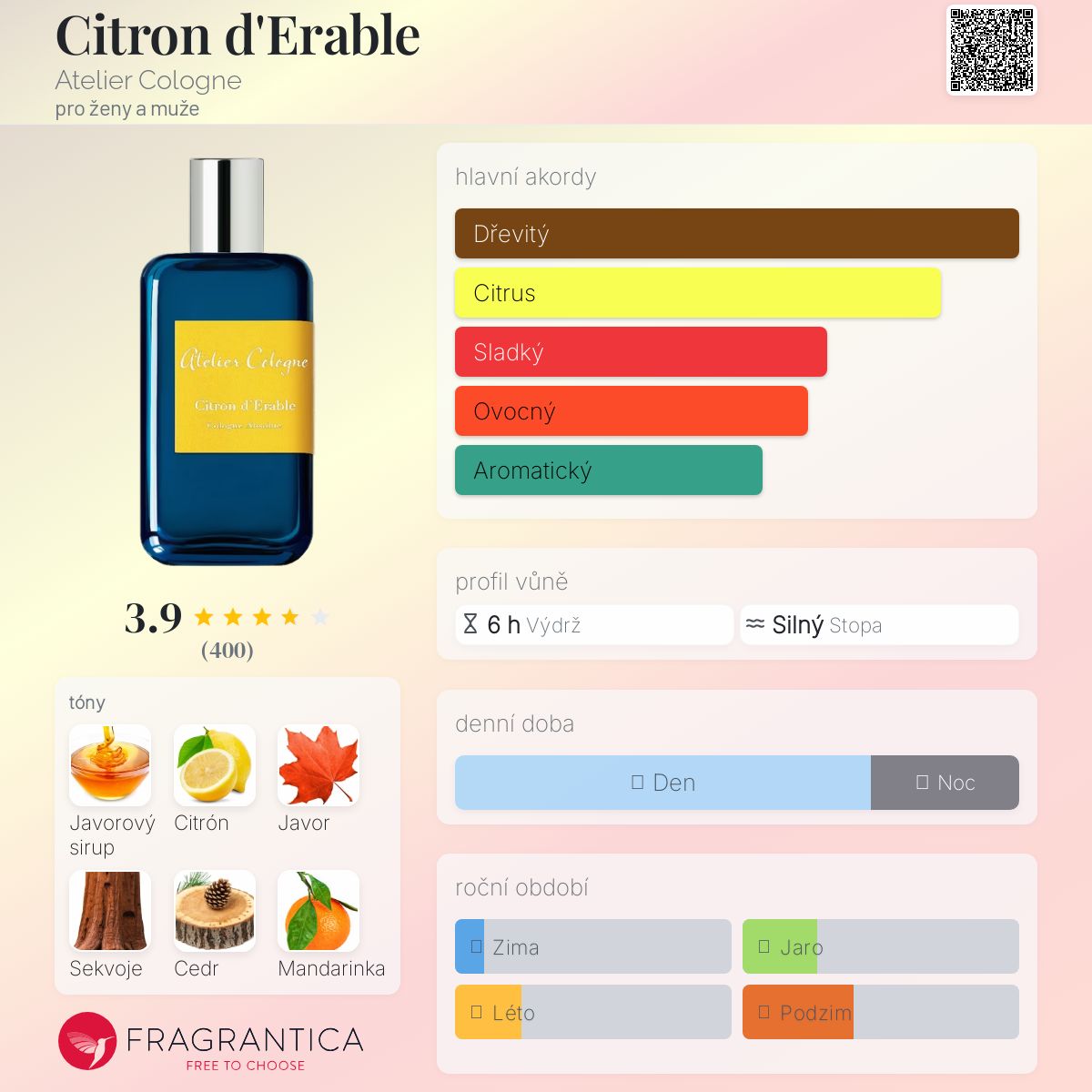 Citron d'Erable podle Atelier Cologne je Woody Aromatic vůně pro ženy a muže. Citron d'Erable byl/a uveden/a v roce 2016. Vrchní tóny jsou Citrón, Mandarinka a Sečuánský pepř; střední tóny jsouJavorová míza, Černý rybíz a Eukalyptus ; základní tóny jsou Javor, Sekvoje a Cedr.