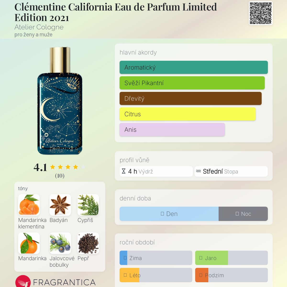 Clémentine California Eau de Parfum Limited Edition 2021 podle Atelier Cologne je vůně pro ženy a muže. Clémentine California Eau de Parfum Limited Edition 2021 byl/a uveden/a v roce 2021. Vrchní tóny jsou Mandarinka klementina, Mandarinka a Jalovcové bobulky; střední tóny jsouBadyán, Pepř a Bazalka ; základní tóny jsou Cypřiš, Haitský vetiver a Santalové dřevo.