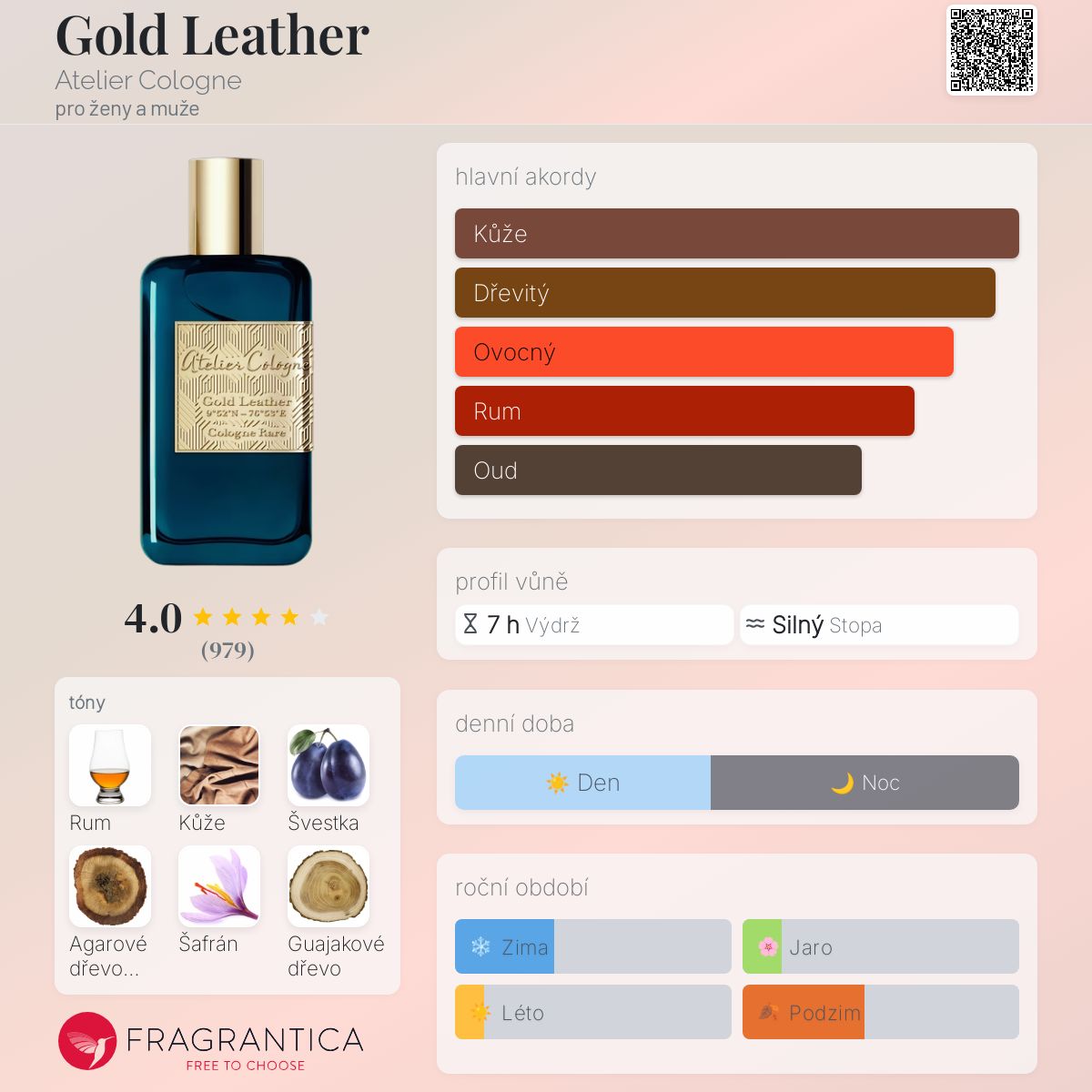 Gold Leather podle Atelier Cologne je Leather vůně pro ženy a muže. Gold Leather byl/a uveden/a v roce 2013. Vrchní tóny jsou Rum, Švestka, Šafrán a Hořký pomeranč; střední tóny jsouEukalyptus a Pelyněk ; základní tóny jsou Kůže, Agarové dřevo (oud), Guajakové dřevo a Cedr.