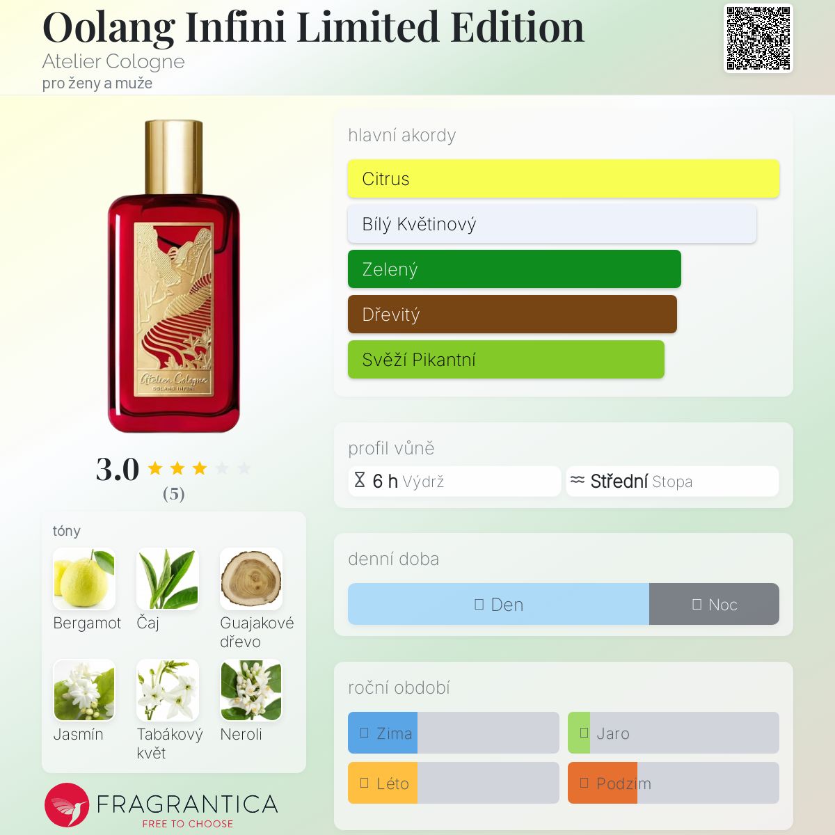 Oolang Infini Limited Edition podle Atelier Cologne je Woody Aromatic vůně pro ženy a muže. Oolang Infini Limited Edition byl/a uveden/a v roce 2021. Vrchní tóny jsou Bergamot a Tuniské neroli; střední tóny jsouČaj, Jasmín a Kůže ; základní tóny jsou Guajakové dřevo, Tabákový květ a Haitský vetiver.