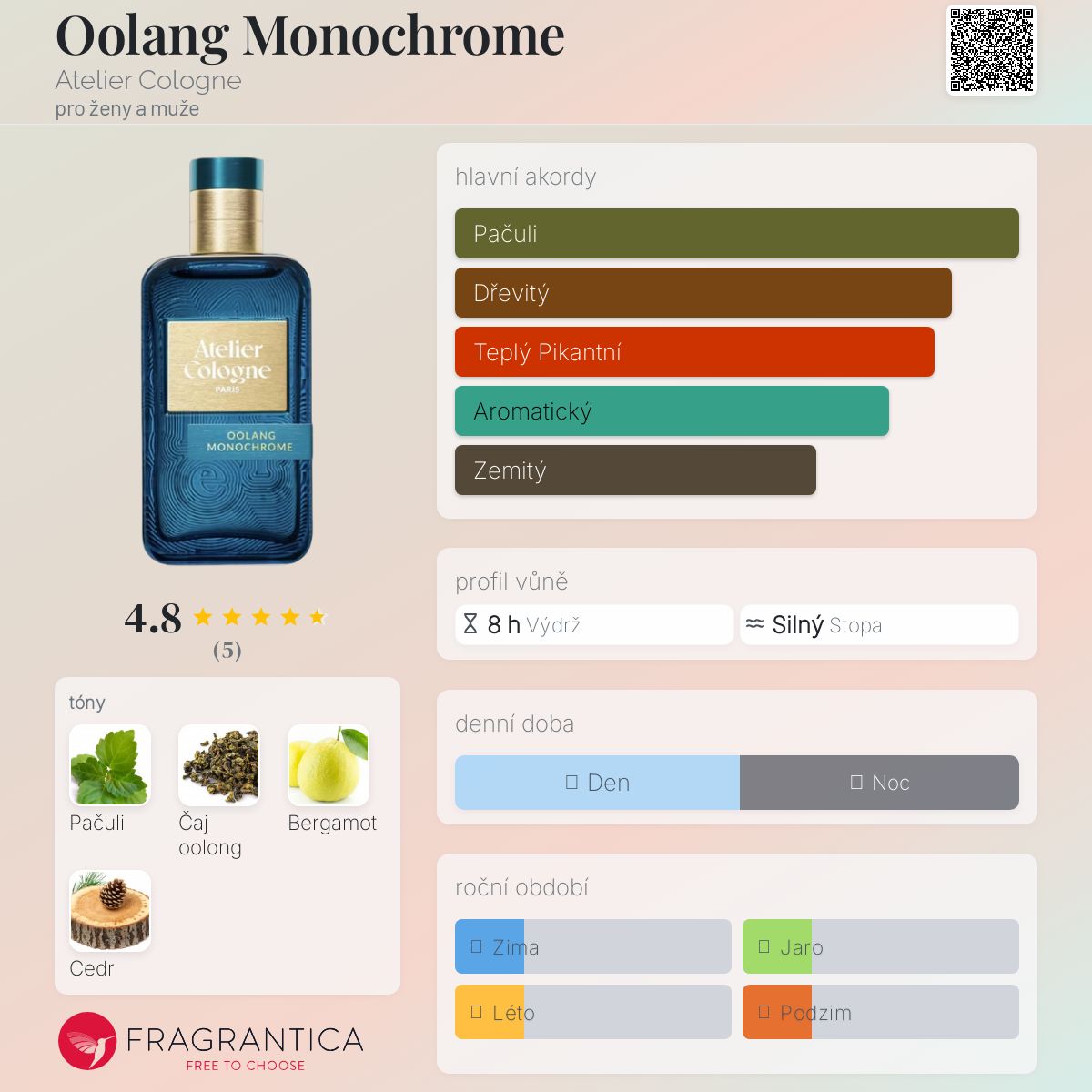 Oolang Monochrome podle Atelier Cologne je vůně pro ženy a muže. Toto je nová vůně. Oolang Monochrome byl/a uveden/a v roce 2025. Oolang Monochrome byl/a vytvořen/a Meabh McCurtin a Domitille Michalon-Bertier. Vrchní tón je Pačuli ; střední tón jeČaj oolong ; základní tóny jsou Bergamot a Cedr.