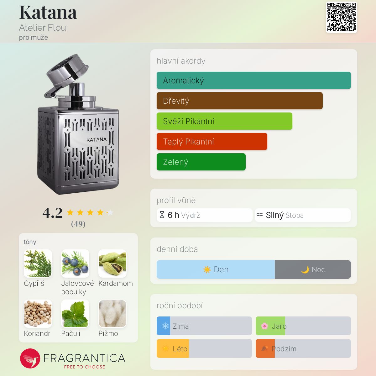 Katana podle Atelier Flou je Orientální Spicy vůně pro muže. "Nosem" za touto vůní je Jean-Francois Cabos. Vrchní tóny jsou Cypřiš a Jalovcové bobulky; střední tóny jsouKardamom a Koriandr ; základní tóny jsou Pačuli a Pižmo.